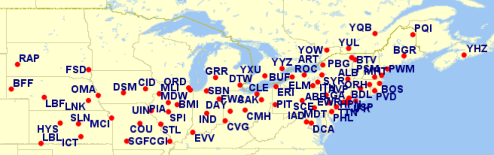 - Airports covered (January 19-20): Albany, NY (ALB); Allentown, PA (ABE); Bangor, ME (BGR); Boston, MA (BOS); Buffalo, NY (BUF); Burlington, VT (BTV); Chicago, IL (ORD); Elmira, NY (ELM); Halifax, NS, CA (YHZ); Harrisburg, PA (MDT); Hartford, CT (BDL); Ithaca, NY (ITH); London, ON, CA (YXU); Manchester, NH (MHT); Montréal, QC, CA (YUL); New York/Newark, NJ (EWR); New York-Kennedy, NY (JFK); New York-LaGuardia, NY (LGA); Philadelphia, PA (PHL); Pittsburgh, PA (PIT); Plattsburgh, NY (PBG); Portland, ME (PWM); Presque Isle, ME (PQI); Providence, RI (PVD); Quebec City, QB, CA (YQB); Rochester, NY (ROC); State College, PA (SCE); Syracuse, NY (SYR); Toronto, ON, CA (YYZ); White Plains, NY (HPN); Wilkes-Barre/Scranton, PA (AVP)
