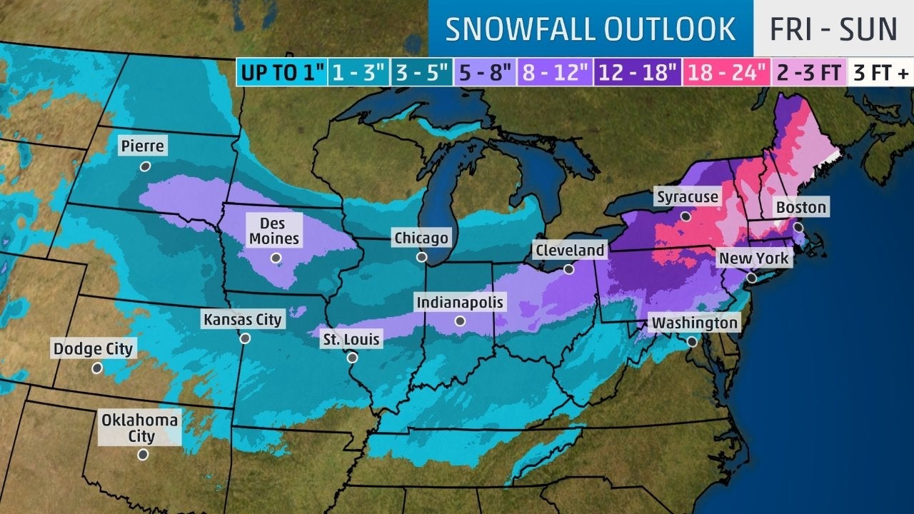 While the winter storm is expected to dump snow in the Rockies Thursday, it'll pick up strength as it sweeps eastward. By the time it hits Maine, more than three feet of snow is expected in parts of the state.