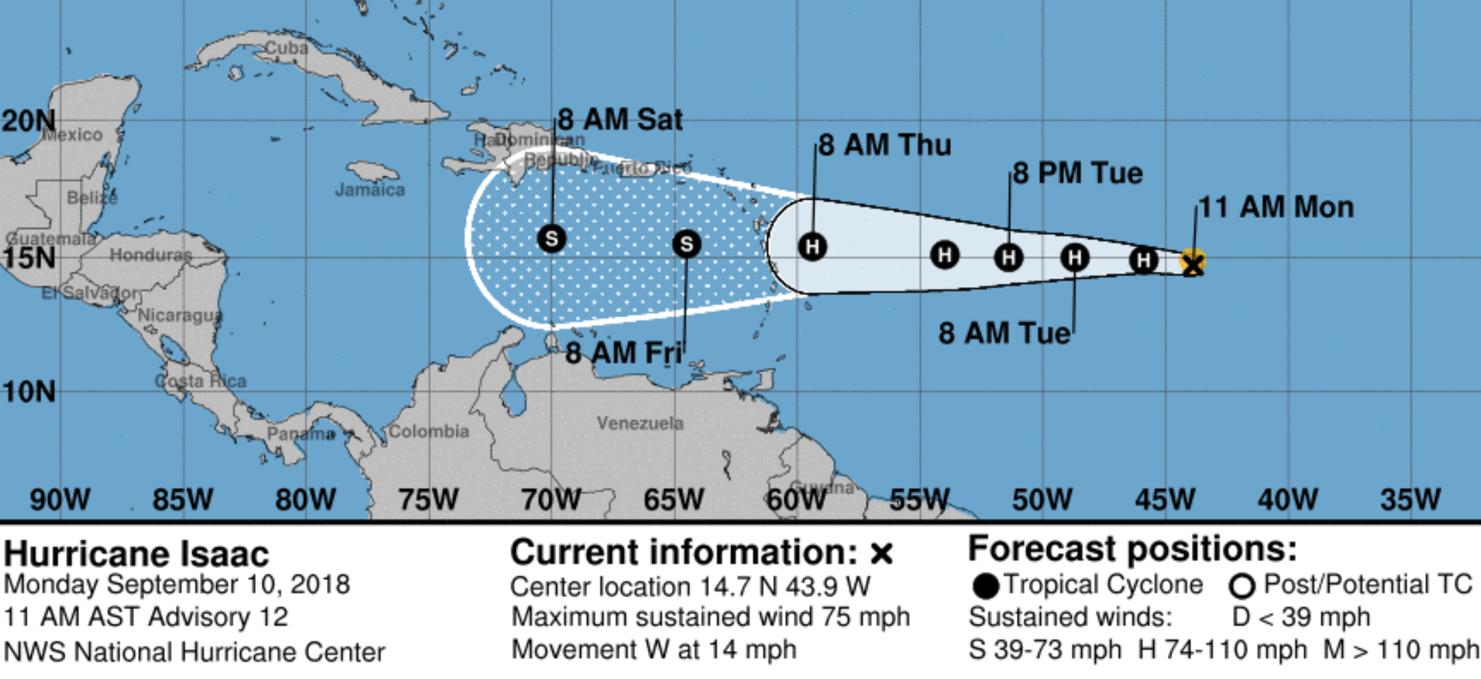 Joining Hurricane Florence in the Atlantic is a much weaker Category 1 Hurricane Isaac. As of the 11:00am National Hurricane Center update, Isaac is barely holding onto hurricane status. Minor strengthening is expected over the next 24 hours before the hurricane starts to weaken just before hitting the Lesser Antilles.