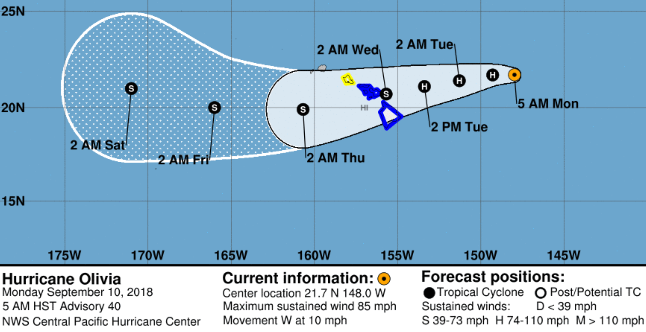 As of the 2:00pm ET (8:00am Hawaiian) intermediate advisory, Hurricane Olivia is still maintaining its hurricane strength. However, it's expected to weaken overnight on Tuesday before making landfall on the Hawaiian islands Wednesday morning. Tropical storm warnings are currently active for the islands of Maui, Molokai, Lanai, Kahoolawe and the Big Island.