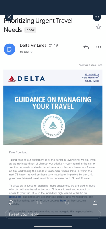 As a result, worried travelers are flooding airline help lines to cancel or reschedule upcoming trips. In an e-mail sent out by Delta, the airline is asking customers who are not traveling within the next 72-hours to refrain from calling. This way, Delta can prioritize customers with more urgent travel needs.