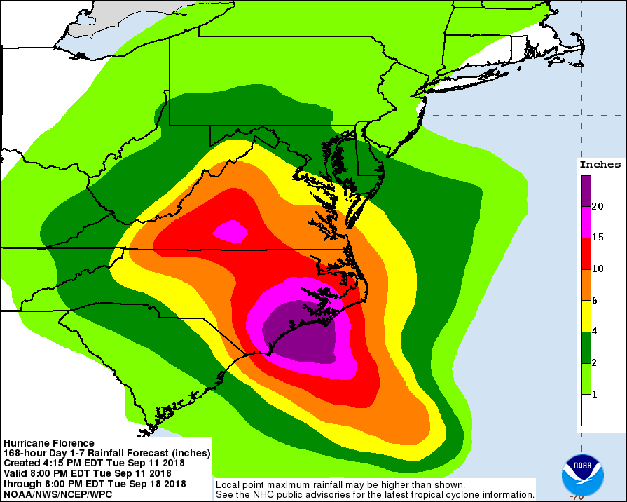 The NHC predicts that this will cause "life-threatening, catastrophic flash flooding and significant river flooding" through the Carolinas and into Virginia. With each update, the predicted rainfall totals have gotten more concerning — especially for the coast that's expected to take a beating from the strong winds and high surf. While the map below tops out at 20 inches of rain, NHC forecasts note that the storm may dump "isolated maximum amounts of 35 inches" of rain in parts of the warning area.