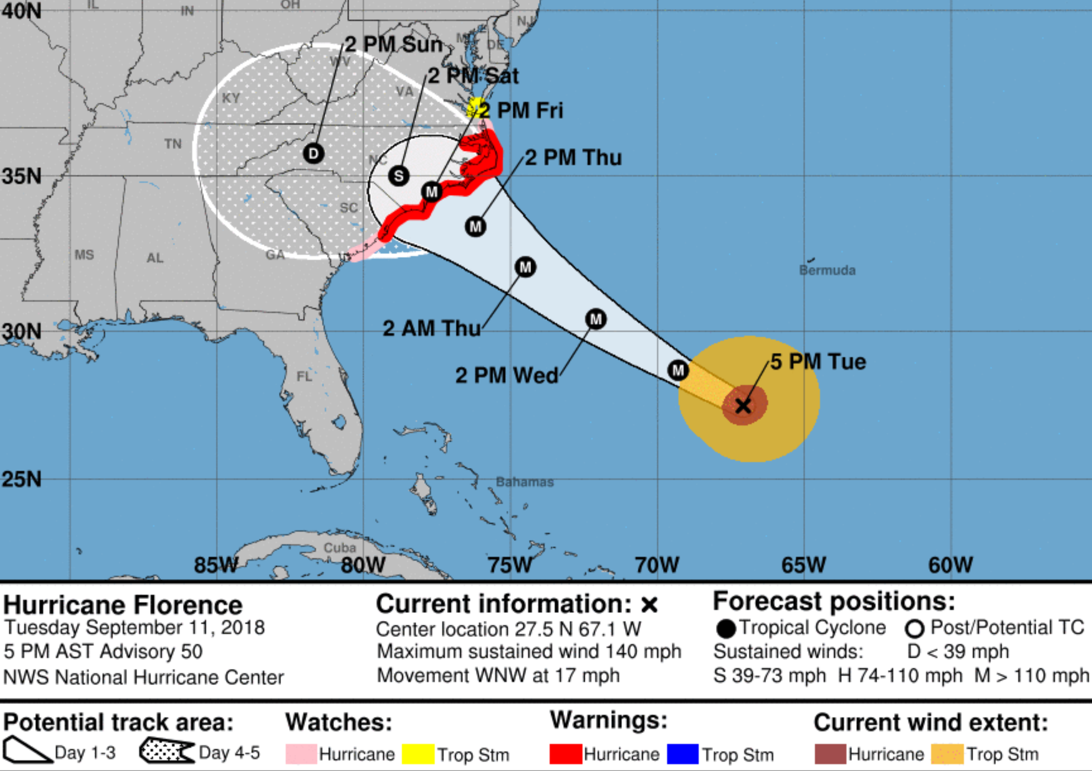 As of the 5:00pm National Hurricane Center advisory, Hurricane Florence completed its eyewall replacement cycle and regained 140mph top sustained winds. As the storm will remain in a very favorable environment over the next 24 hours, Florence is expected to strengthen further. Forecasts still call for Florence to retain "major hurricane" status when it makes landfall on the North Carolina coast on Friday afternoon.