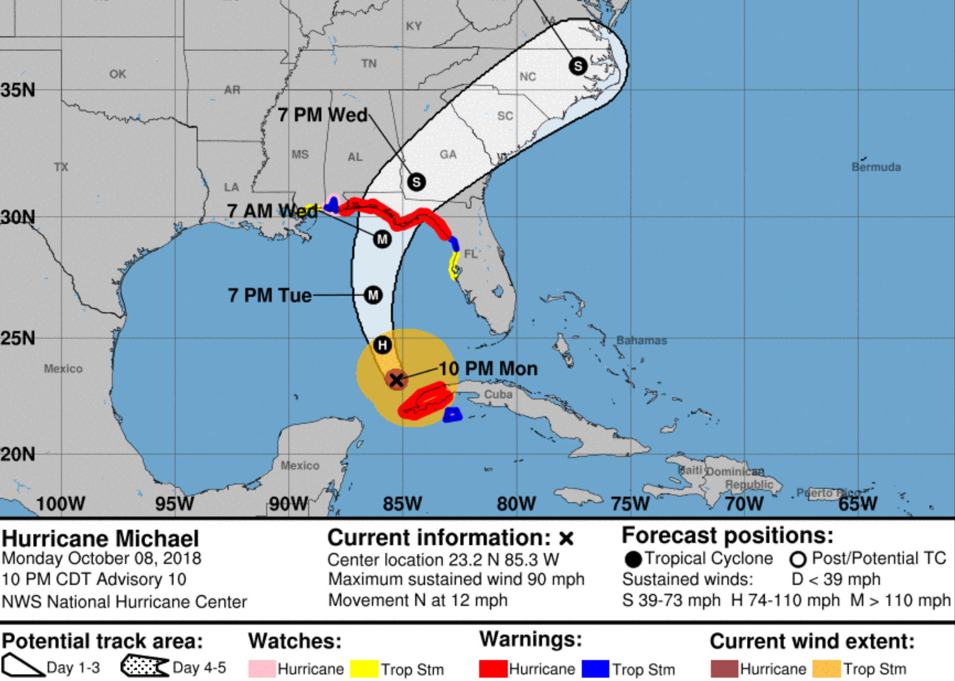 Although it just developed as a tropical storm Sunday afternoon, Hurricane Michael has quickly strengthened into a dangerous hurricane. As of the 11pm ET advisory, the hurricane has top sustained winds of 90mph, but it's expected to make landfall Wednesday afternoon as a major hurricane packing 120mph winds.