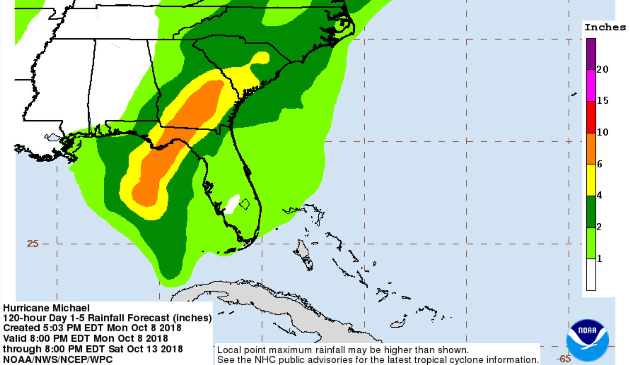 Unlike recent disasters of Hurricanes Harvey and Florence, Hurricane Michael isn't expected to be as terrible of a rain event for the Southeast. Still, 6-10 inches of rain are expected across a wide swath of the Southeast, with some of the areas hard hit by Hurricane Florence getting another round of rains on top of already saturated ground.