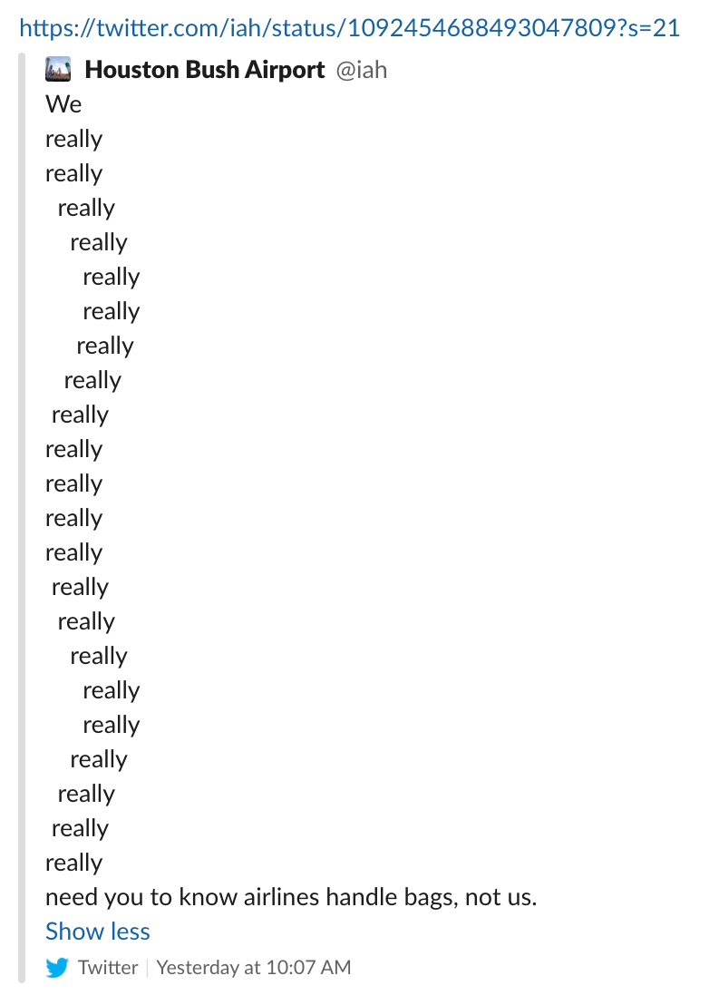 George Bush Intercontinental Airport in Houston must have been having a particularly bad case of the Mondays. As one does, the airport took to social media Monday to vent its frustrations:
