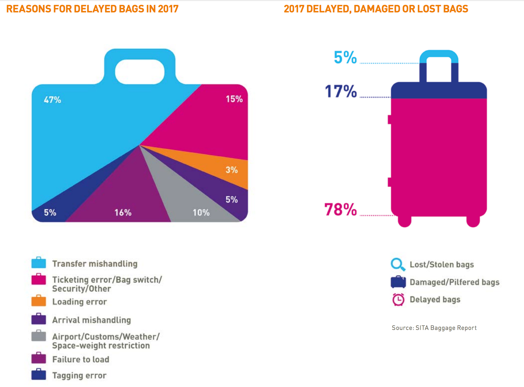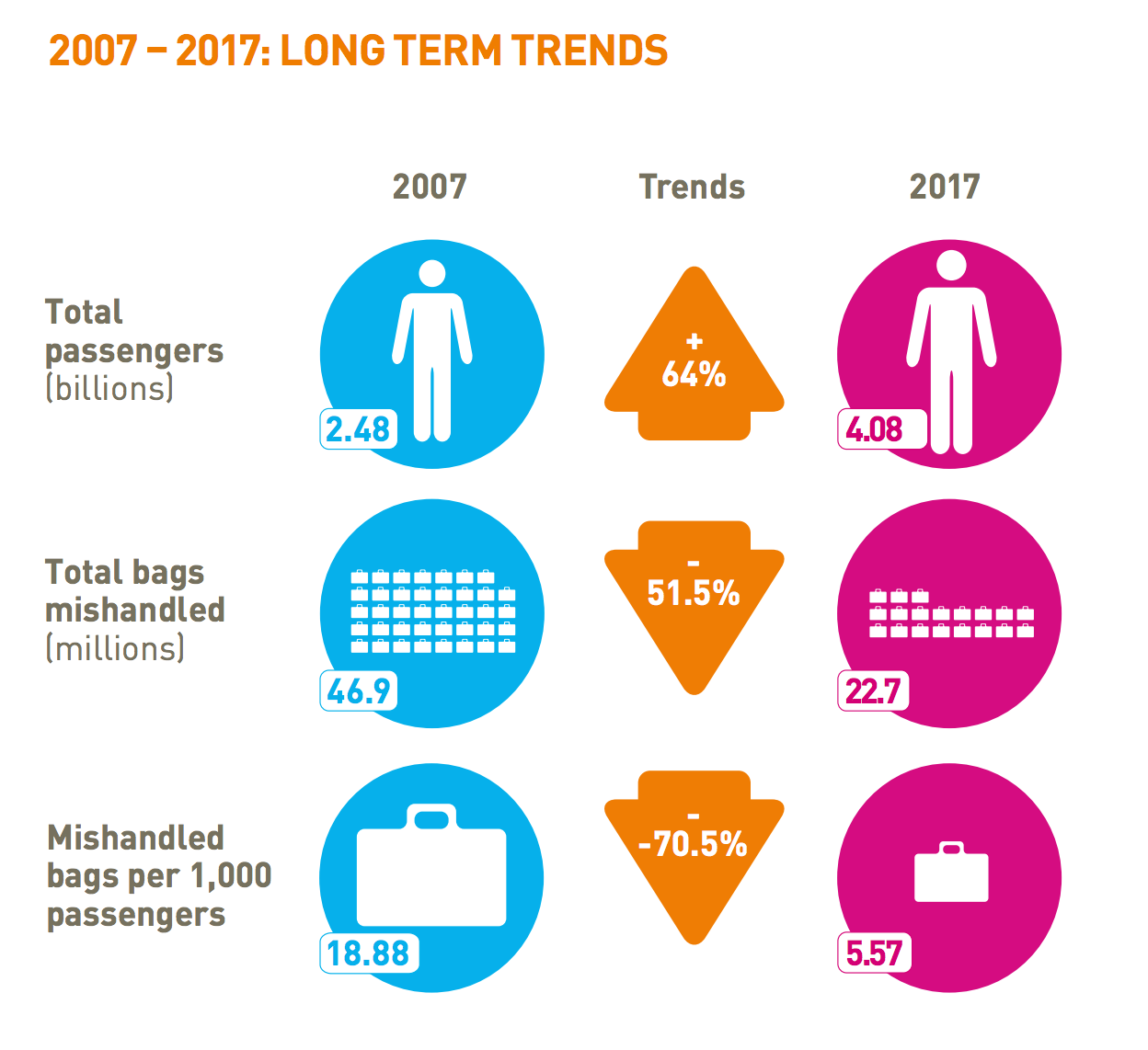 Overall, however, baggage mishandling has dropped by more than 70% since 2007, even while the number of travelers has more than doubled, from 2.48 billion to 4.08 billion. Meanwhile, millions of dollars invested in technology and more efficient bag-tracking techniques have greatly contributed to the decrease in mishandled bags has decreased from 18.88 per 1,000 passengers in 2007, to 5.57 per 1,000. According to the SITA report, by far the biggest global factor in baggage delays stems from transfer mishandling — when bags are going between different planes, sometimes in different countries across different carriers.