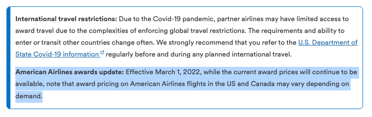 "Effective March 1, 2022, while the current award prices will continue to be available, note that award pricing on American Airlines flights in the US and Canada may vary depending on demand."