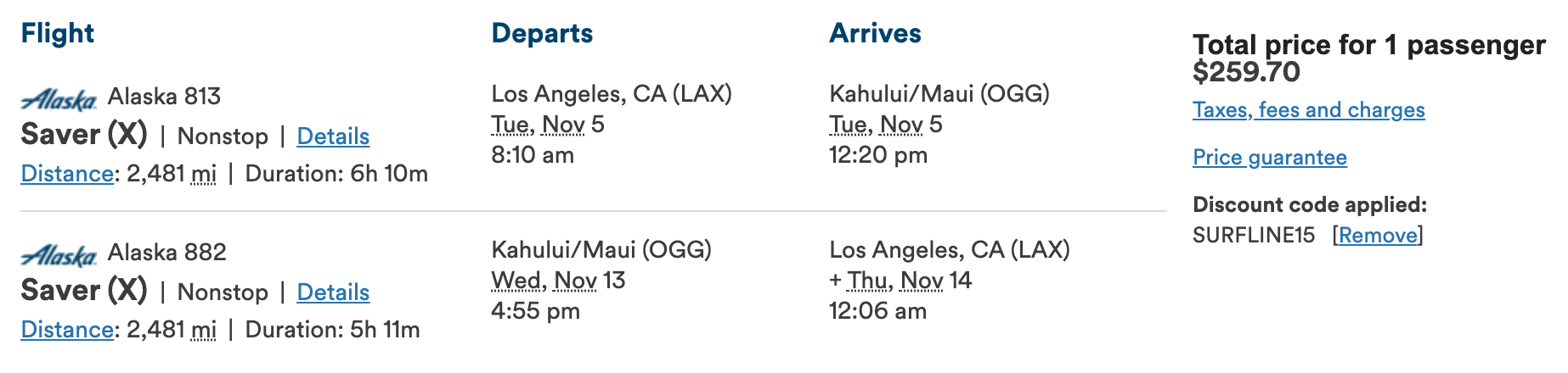At the time of publishing, the discount already reached 15% off. That means that you can currently escape to Hawaii as soon as tomorrow, Nov. 5, for as low as $260 round-trip from Los Angeles (LAX) to Kahului (OGG).