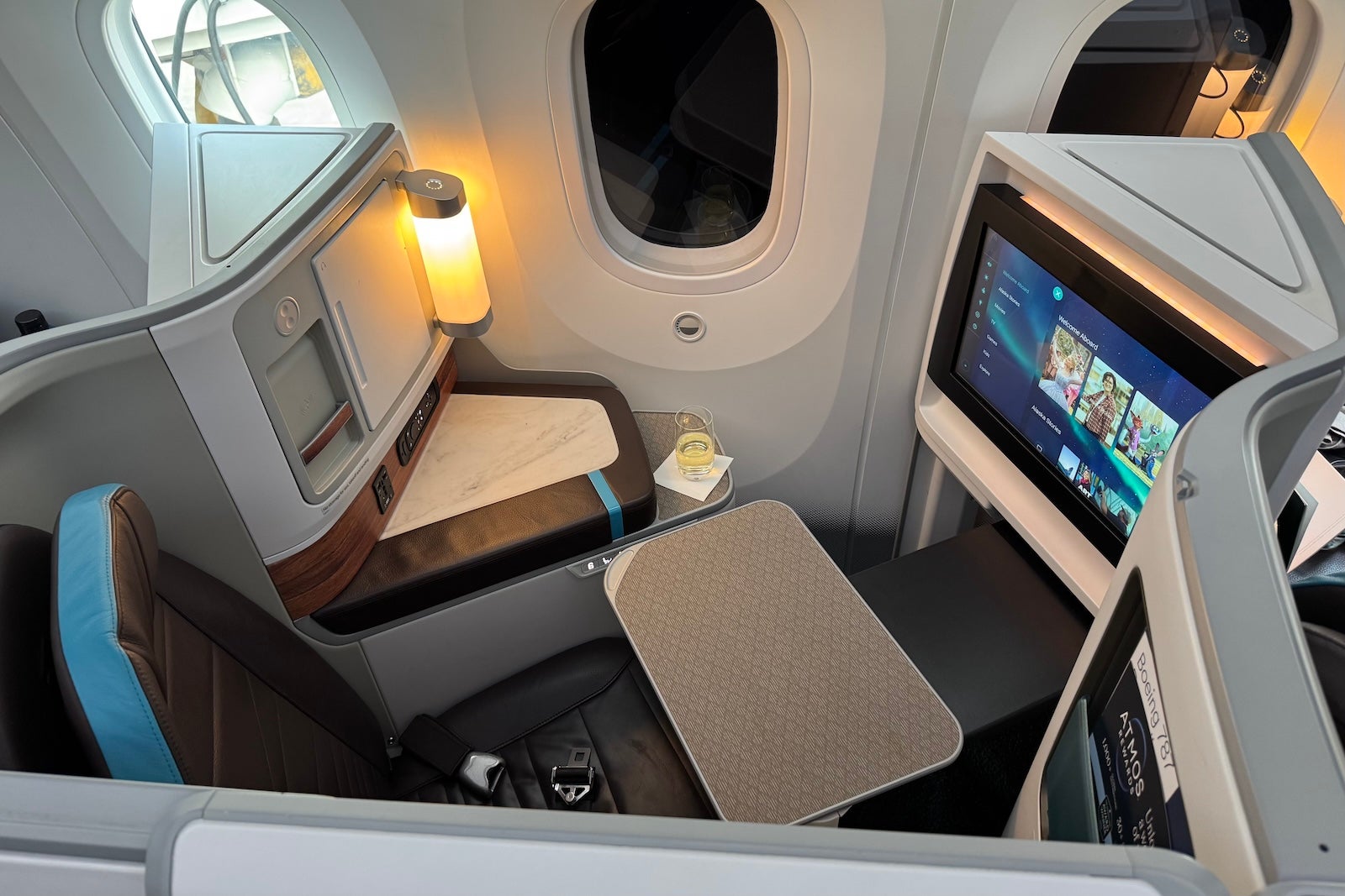 On board, one thing is obvious: This is very much the same (beautiful) Dreamliner that Hawaiian debuted in 2024. Look no further than the blue, coral-inspired seat coverings.