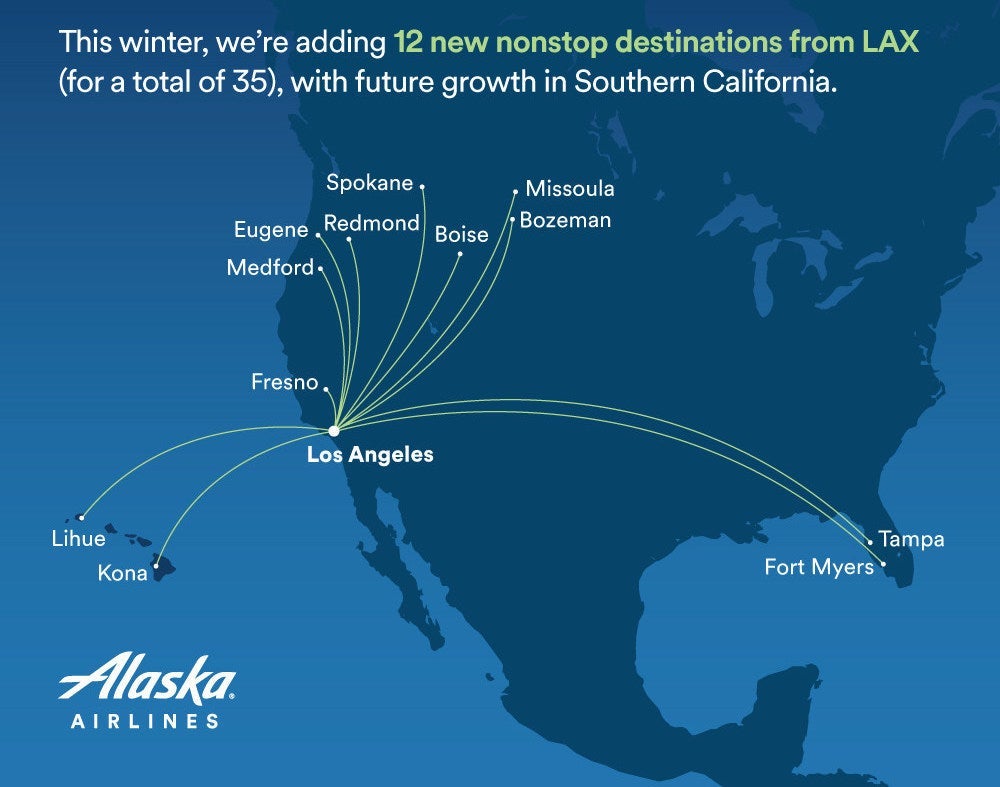 Alaska Airlines plans to fly 35 routes from Los Angeles (LAX) — its most ever — by the year's end. That will come after eight new routes that will launch between September and December, the Seattle-based carrier said Thursday. The additions range from Eugene (EUG) and Medford (MFR) in Oregon to Kona (KOA) and Lihue (LIH) in Hawaii, and Tampa (TPA) in Florida.