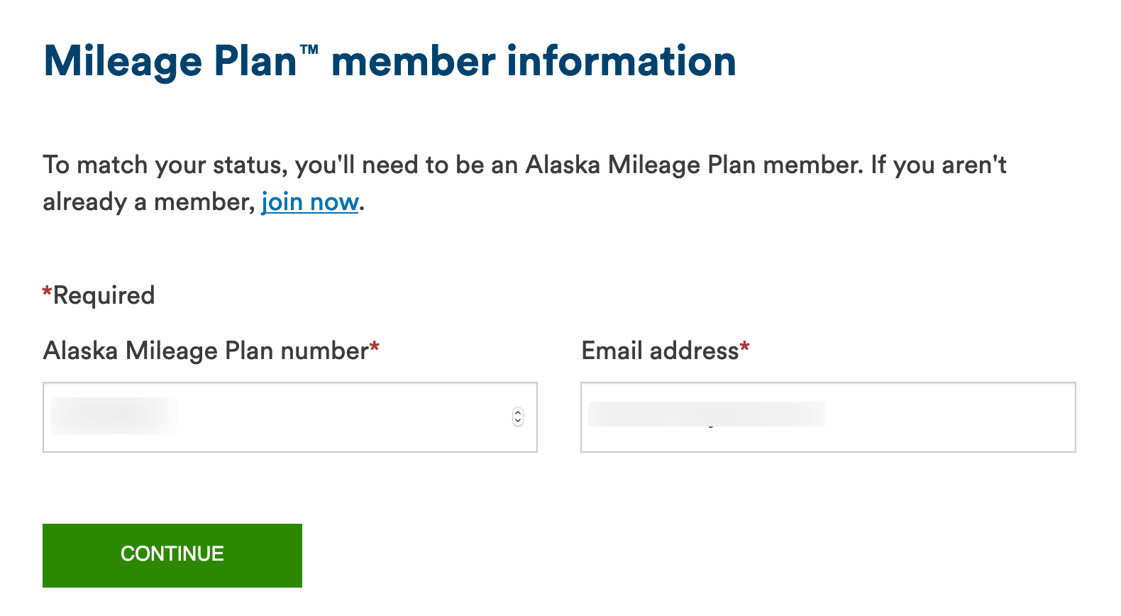 3. Enter your Alaska Mileage Plan number and email address, then click CONTINUE.