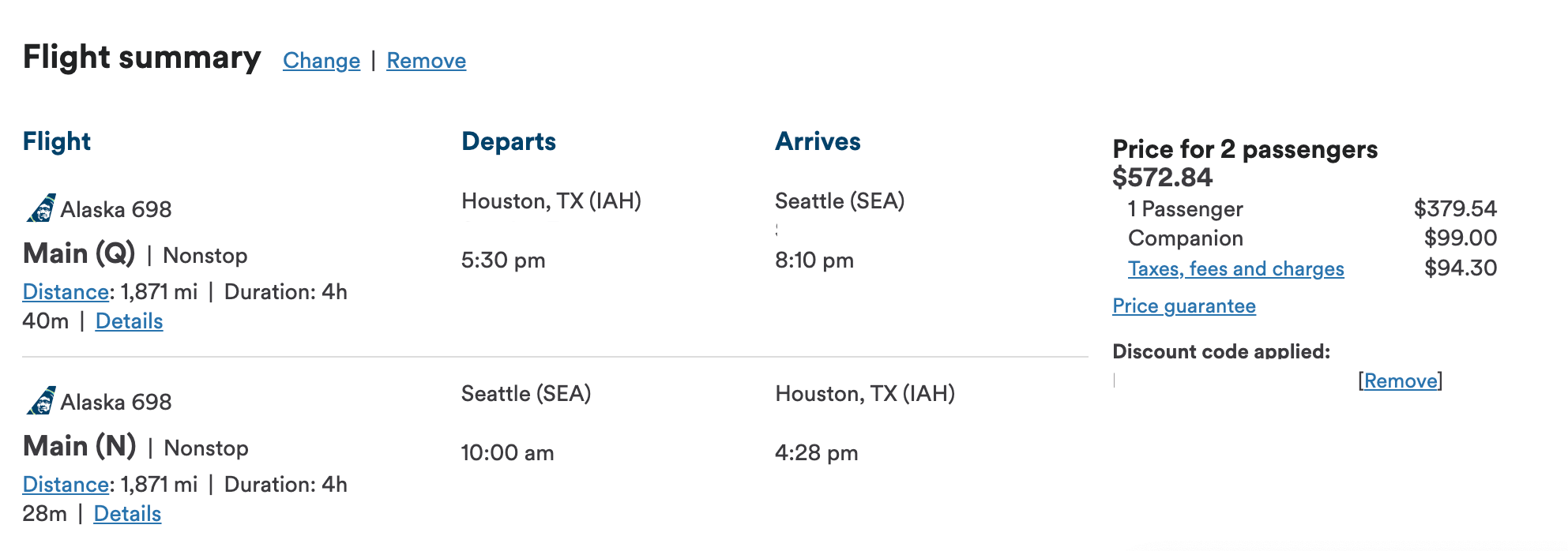 To use the Alaska Airlines companion voucher, purchase one economy fare on a domestic Alaska Airlines-operated flight with your Alaska Airlines credit card (aka not using miles) and then the second ticket will cost you just $99 plus some taxes and fees, which in this case are just under $37.