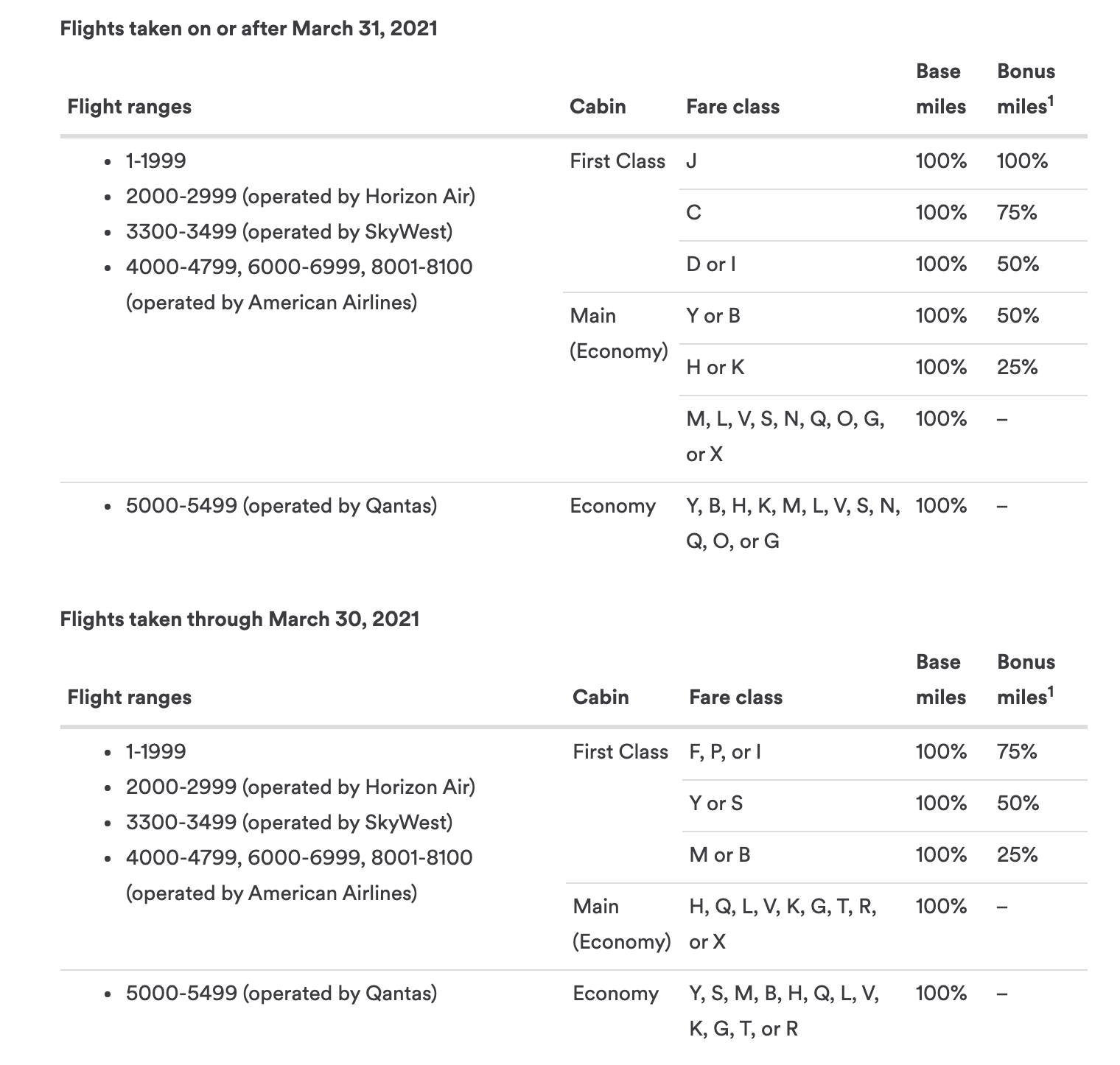 | Fare class (for travel before March 31) | Fare class now becomes (for travel on or after March 31) | Mileage bonus (for travel before March 31) | Mileage bonus (for travel on or after March 31) |