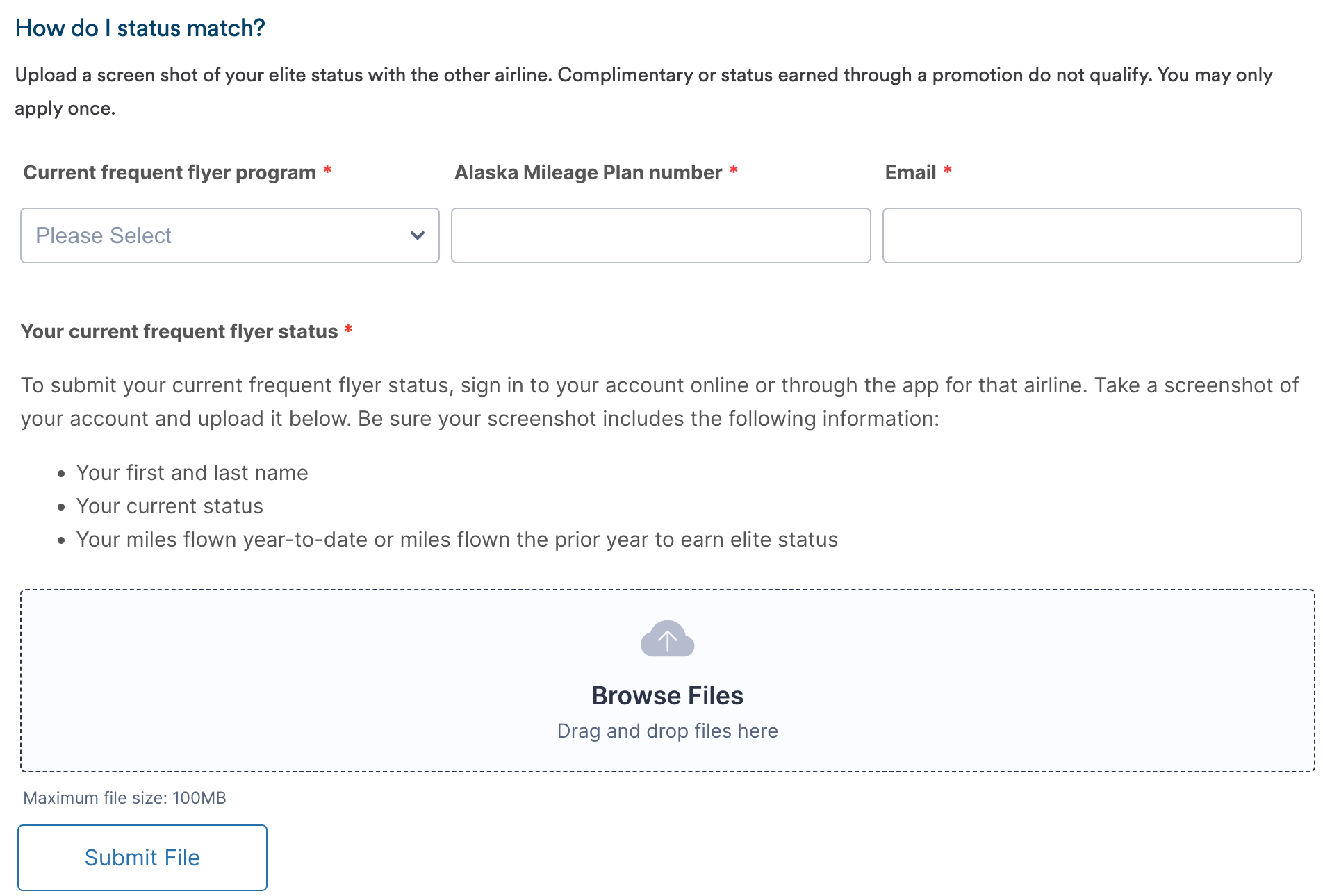 If you are not currently an Alaska Airlines Mileage Plan member, you must sign up for an account to participate in this challenge. Then, simply upload a screenshot of your current elite status in another program to initiate the challenge.