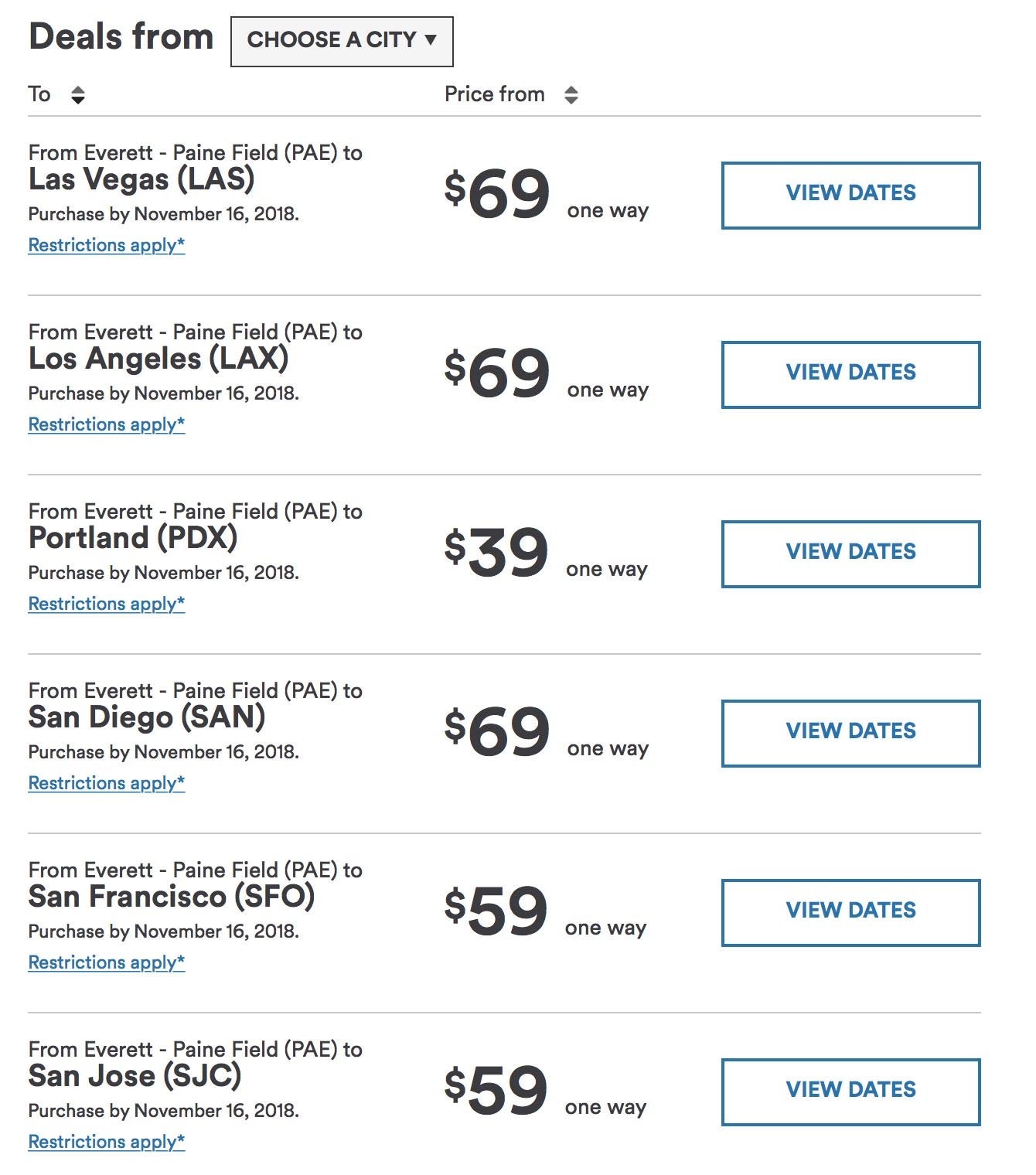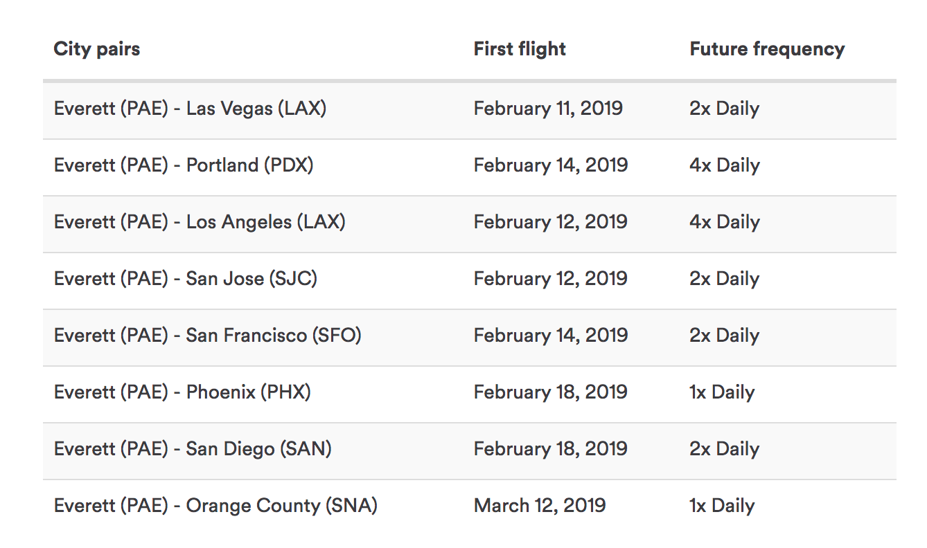 Service is scheduled to start Feb. 11, 2019, subject to government approval, between Everett's Paine Field and Las Vegas (LAS). Flights to other destinations will roll out not long thereafter: Los Angeles (LAX), Orange County (SNA), Phoenix (PHX), Portland (PDX), San Diego (SAN), San Francisco (SFO) and San Jose (SJC).
