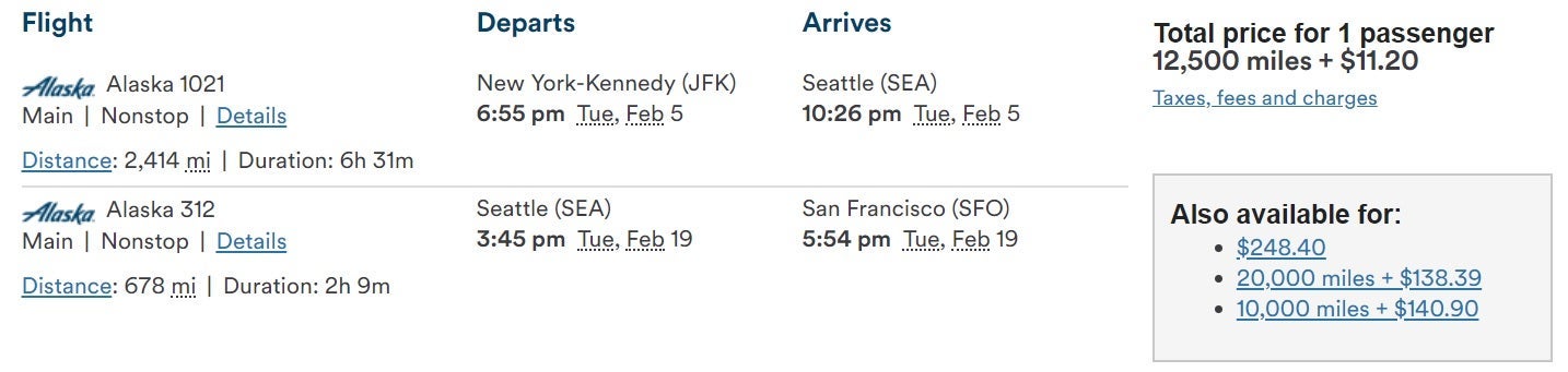 Alaska's stopover policy is one of the most useful award routing rules out there, and is part of why Mileage Plan miles are so valuable. You can not only add a stopover onto one-way awards, but also include partner flights in your itinerary, That creates easy opportunities to visit multiple destinations on one award ticket. For example, flying JFK-SEA-SFO with a lengthy stopover in Seattle costs the same 12,500 miles as a normal one-way: