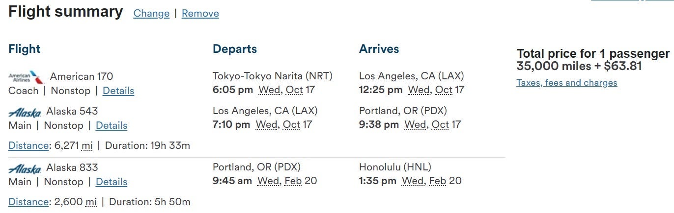 Aaron put this strategy to good use, but he may have missed an opportunity to do the same on his return trip. He paid 35,000 miles per person for his flight from Osaka to Portland, but by tweaking his itinerary a bit, he could have again added a stopover in PDX and another flight elsewhere for the same mileage cost (plus a marginal increase in fees). For example, here's an itinerary from Tokyo to Portland (via Los Angeles) with a flight to Honolulu tacked on four months later: