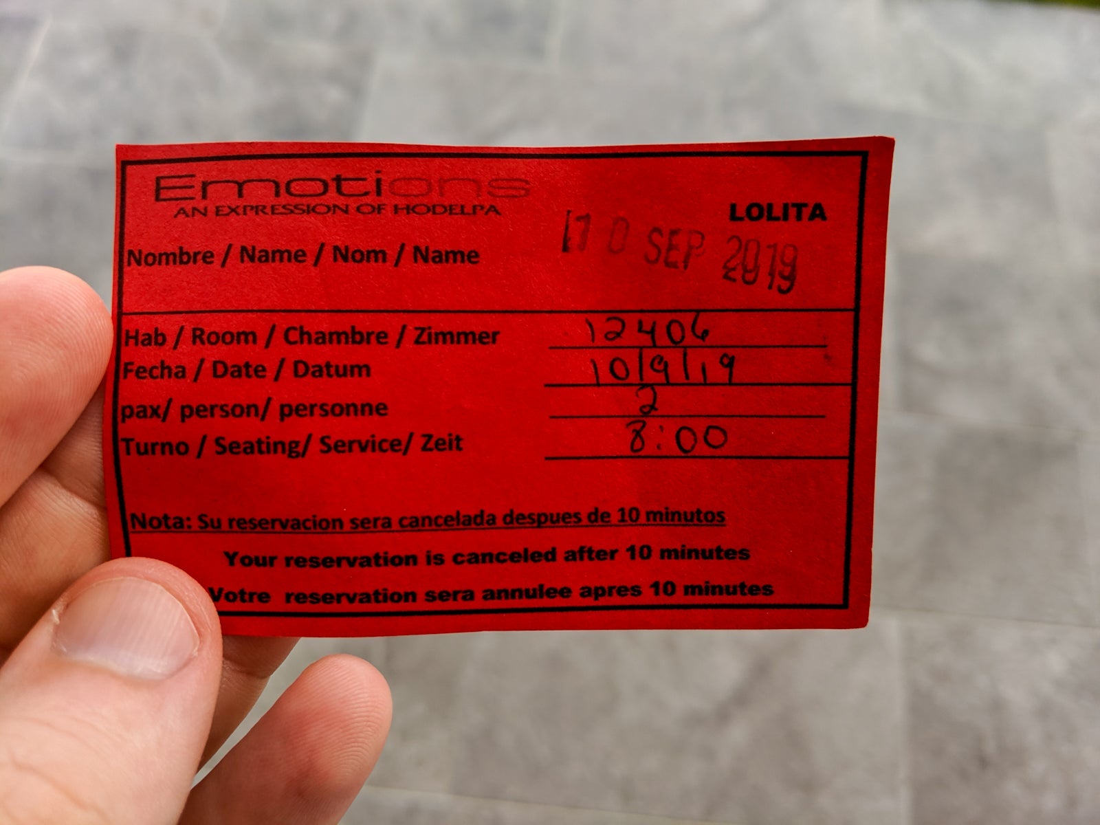To get a reservation, guests needed to go to the buffet restaurant hostess desk each morning to get a reservation from the employee manning the podium. If you got there early enough to get a reservation, you'd get a small slip of color-coordinated paper with your reservation time on it. You'd need to bring this to the restaurant within 10 minutes of your time slot or risk losing your dinner reservation.