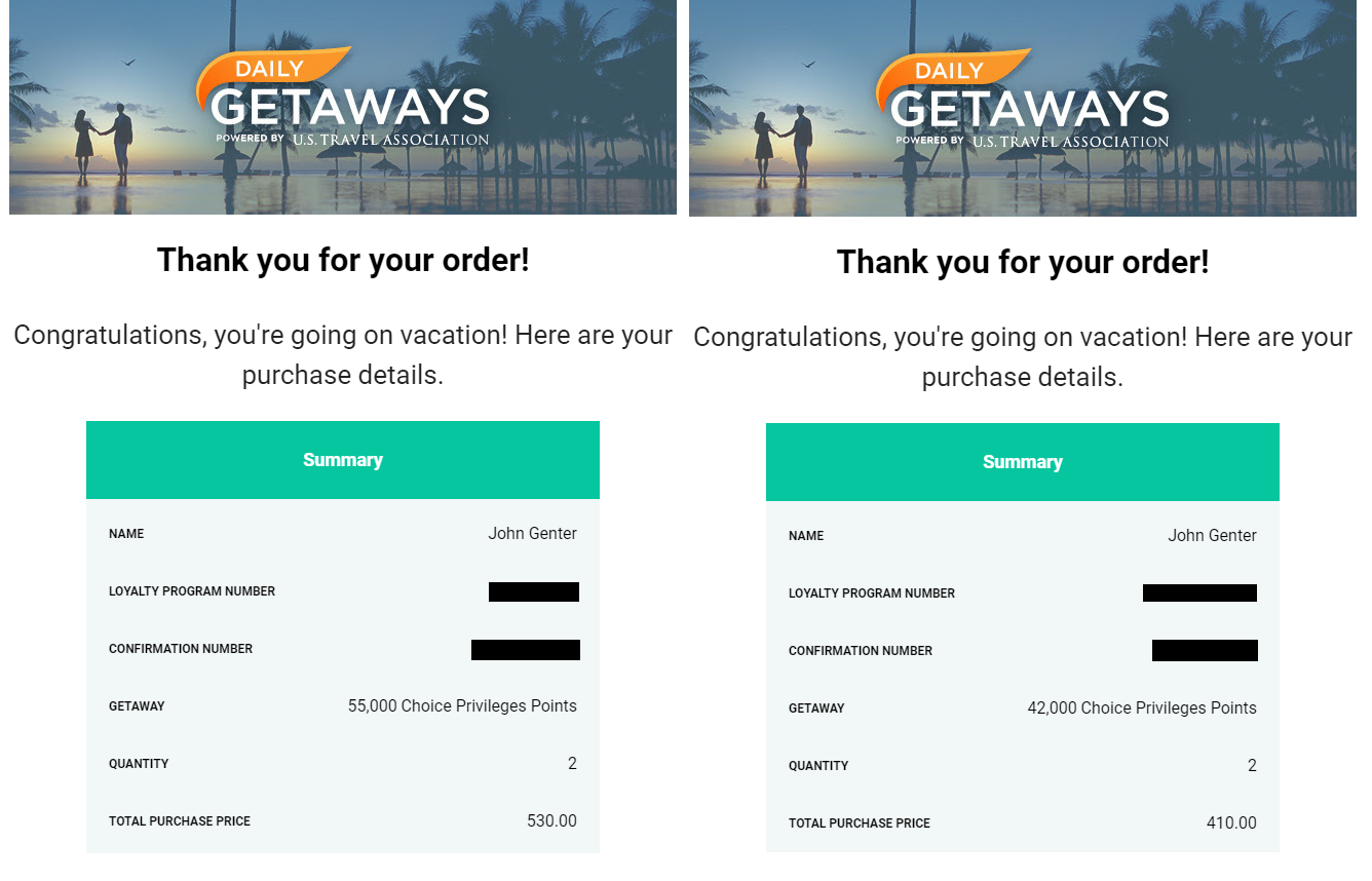 When the Choice packages went live through Daily Getaways, we immediately bought the maximum of two packages of 55,000 points each for $530 and two packages of 42,000 points each for $410 for a total of 194,000 points for $940.