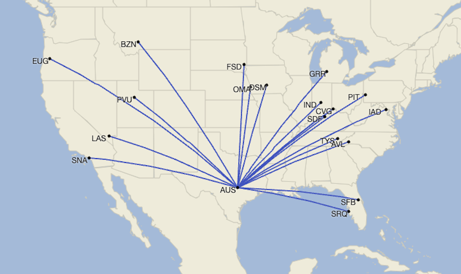 This month, the carrier's Austin route map includes 18 nonstop destinations around the country, according to the below map from aviation analytics firm Cirium.