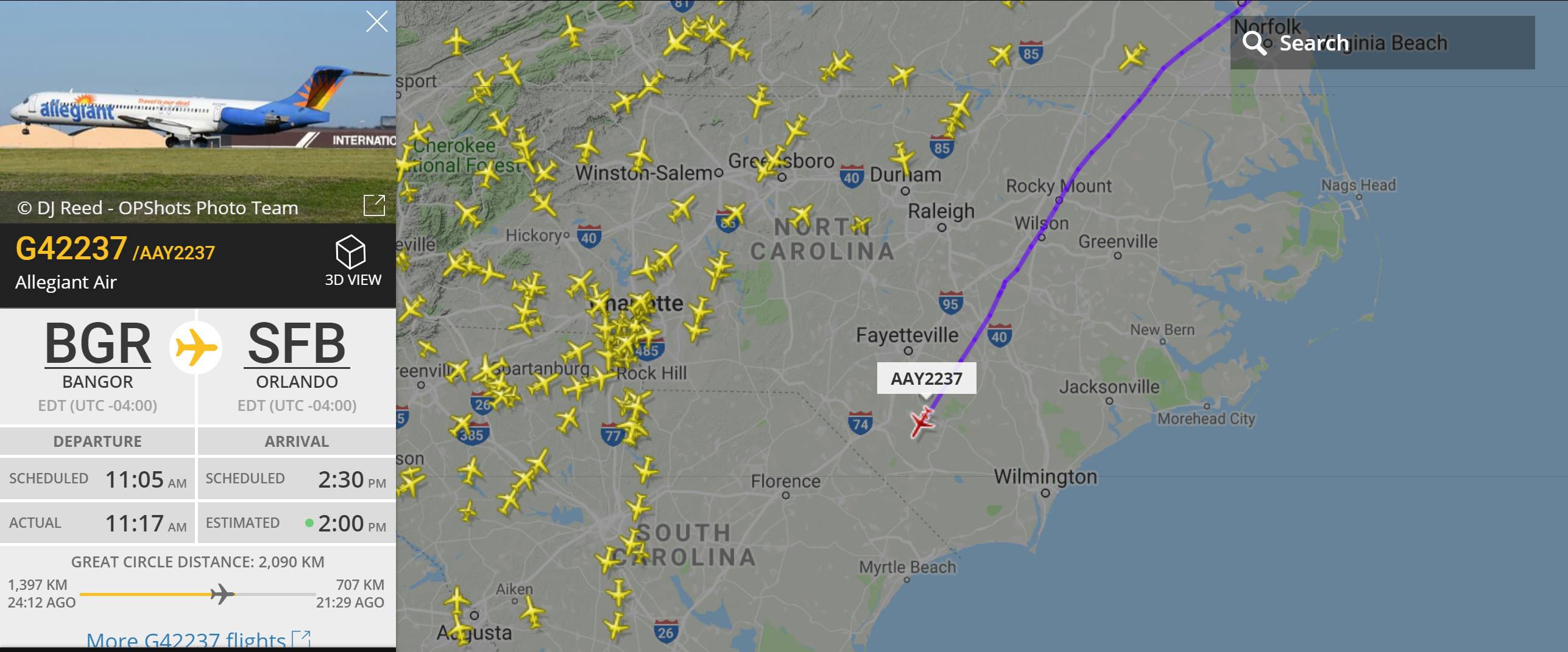 Maybe Allegiant wanted the same sort of acclaim. Or, maybe it figured it could save some fuel by riding solid tailwinds from the hurricane on a flight from Bangor, Maine (BGR) to Orlando's Sanford (SFB) airport.
