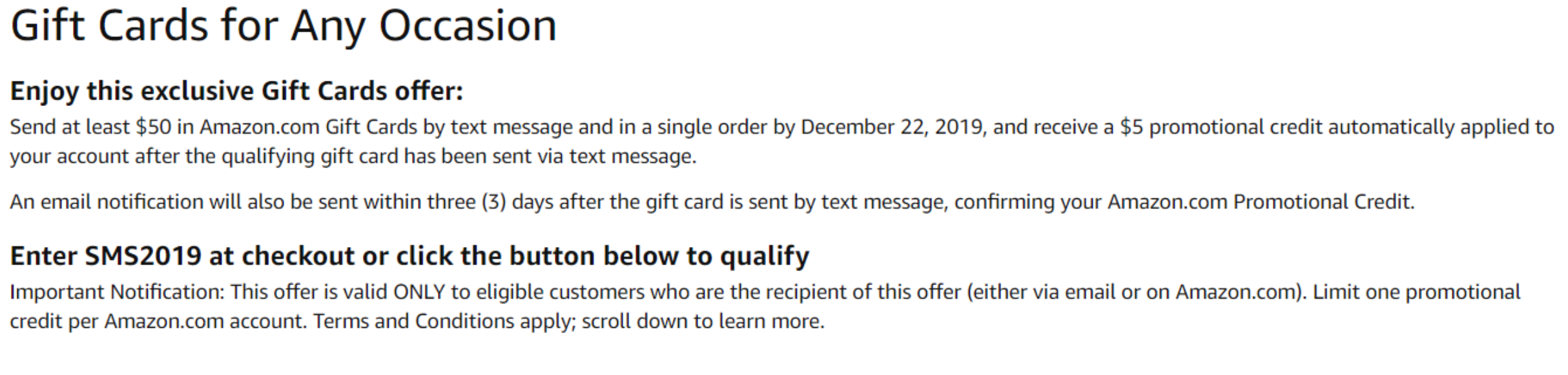 - Purchase a $50 Amazon gift card and send it to the recipient via text, receive a $5 Amazon promotional credit. Expires Dec. 22, 2019