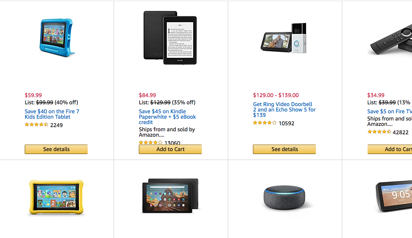 - Amazon Devices: Up to 40% off all Amazon devices. Between Nov. 28 and Dec. 2, 2019, you'll receive 10% back on select Amazon devices when using your Amazon credit card. (The Kids Fire tablet made the TPG list of 2019 family travel must-have gifts!)