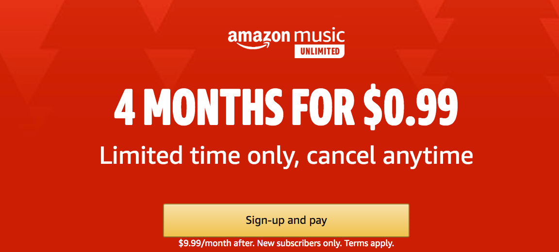- Amazon Music: $0.99 for Amazon Music unlimited for four months ($9.99/month thereafter)