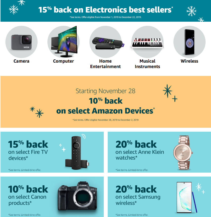 - 10–20% Cash Back with your Amazon Credit Card: If you have the Amazon Prime Rewards or Amazon Prime Store card, you will receive an additional 5–15% back on select products on top of the 5% you already get back at Amazon by using your credit card. Expires Dec. 22, 2019. (Note: 10% back on select Amazon devices will run Nov. 28–Dec. 2, 2019)