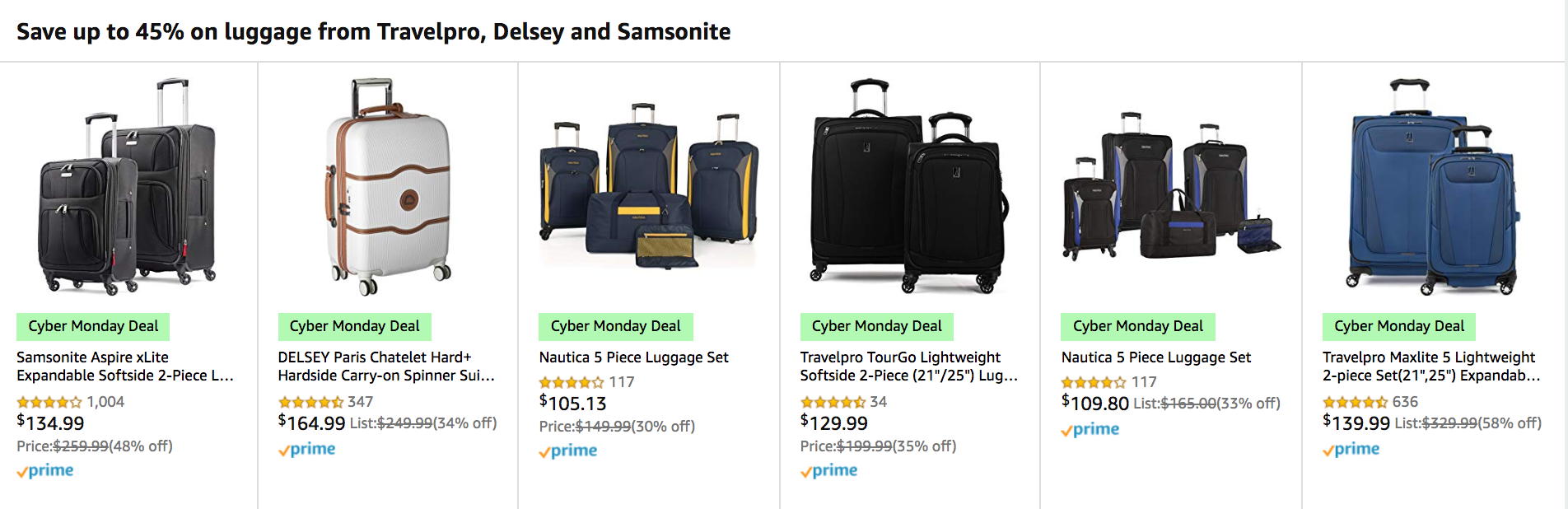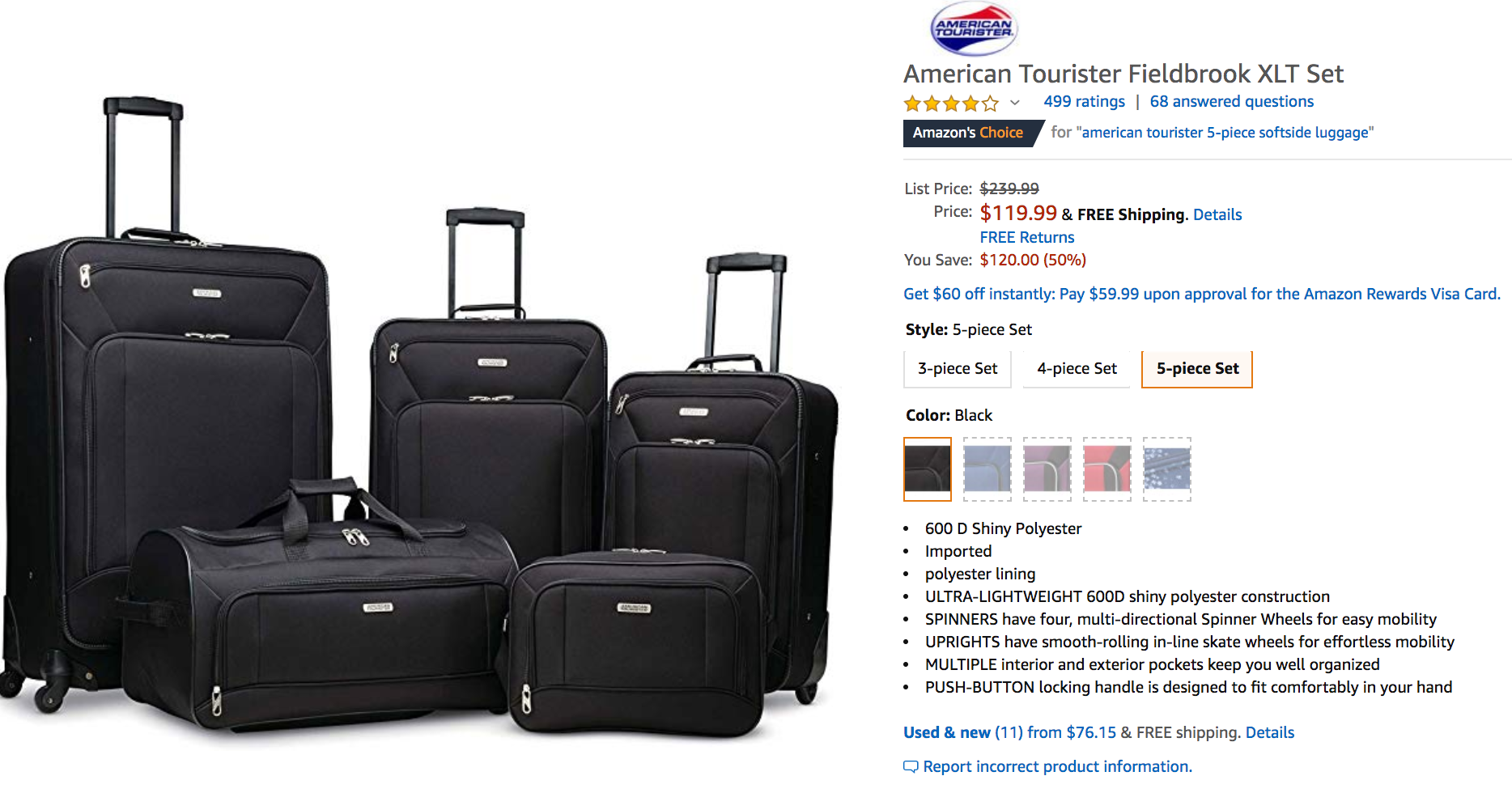 - American Tourister Fieldbrook Luggage: $119.99 for this five-piece set, 50% off (typically priced at $239.99)