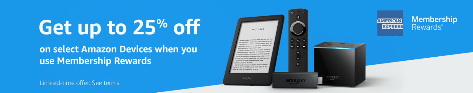 - 25% off Amazon Devices: American Express Membership Rewards cardmembers can receive up to 25% off select Amazon Devices by applying just 1 Membership Reward point at checkout. Expires Dec. 31, 2019.
