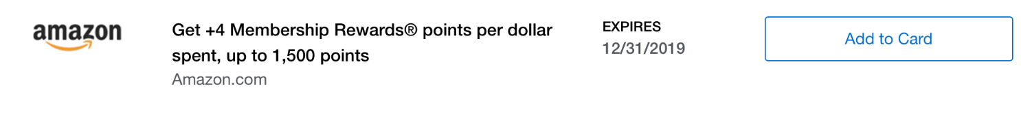 - 4x Membership Reward points: Amex Offers is offering 4x points on all Amazon purchases, up to 1,500 points earned. Make sure to add the offer to your card prior to your purchase. Expires Dec. 31, 2019.