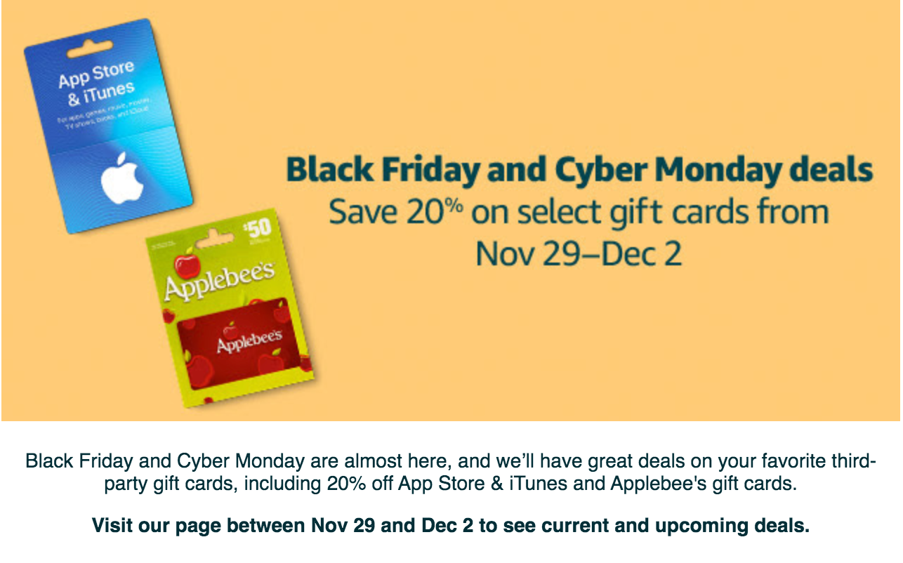 On Nov. 29 and Dec. 2, Amazon will be discounting many of its third-party gift cards by 20%. On Cyber Monday, the discounted gift cards include: