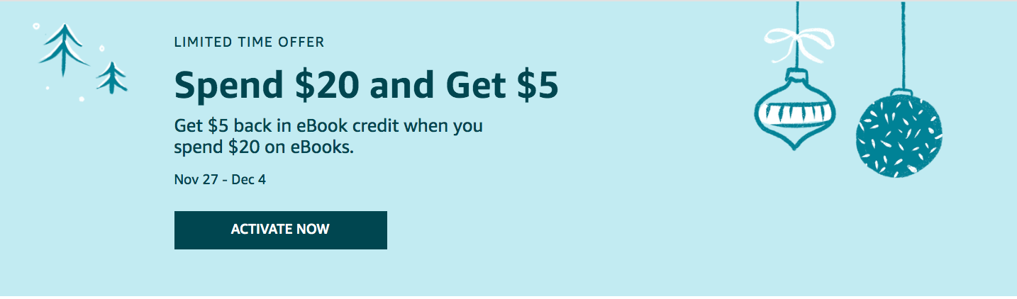 - $5 eBook Credit: Spend $20+ in eBooks and receive a $5 credit to use on a future eBook credit. Credits will hit your account within 2 days and have to be redeemed within 21 days. Expires Dec. 4, 2019.
