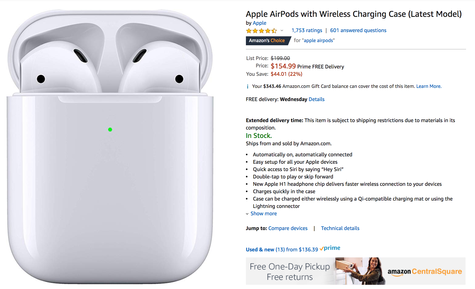 - Apple AirPods with Wireless Charging Case: $154.99 (regularly $199) and Apple AirPods with Charging Case: $139.99 (regularly $159) (These deals have expired.)