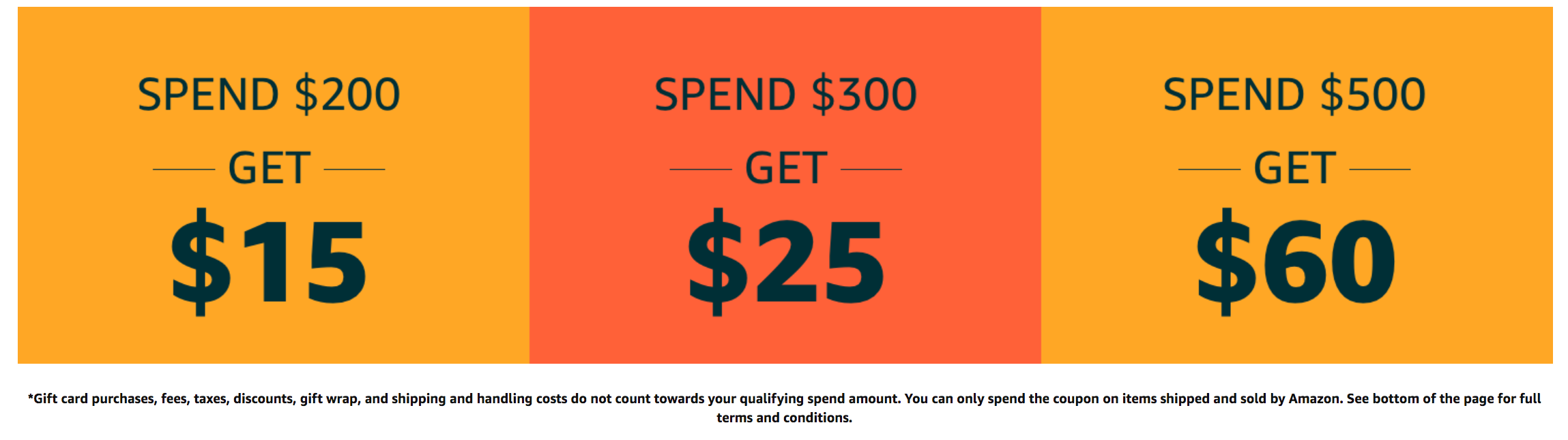 - Purchase a $50 Amazon gift card, receive a $15 Amazon promotional credit. Expires Dec. 22, 2019.