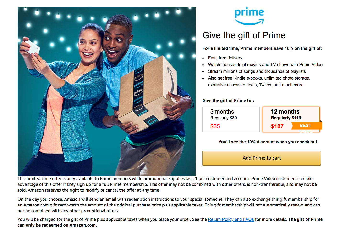 - 10% off Amazon Prime Membership: Purchase a 3-month or 12-month Amazon Prime membership for yourself or as a gift and you'll receive 10% off. This promotion is exclusively for Prime Members. Tip: Have a friend who already has the membership buy it for you and pay them back. Expires Dec. 2, 2019. (This deal has expired.)