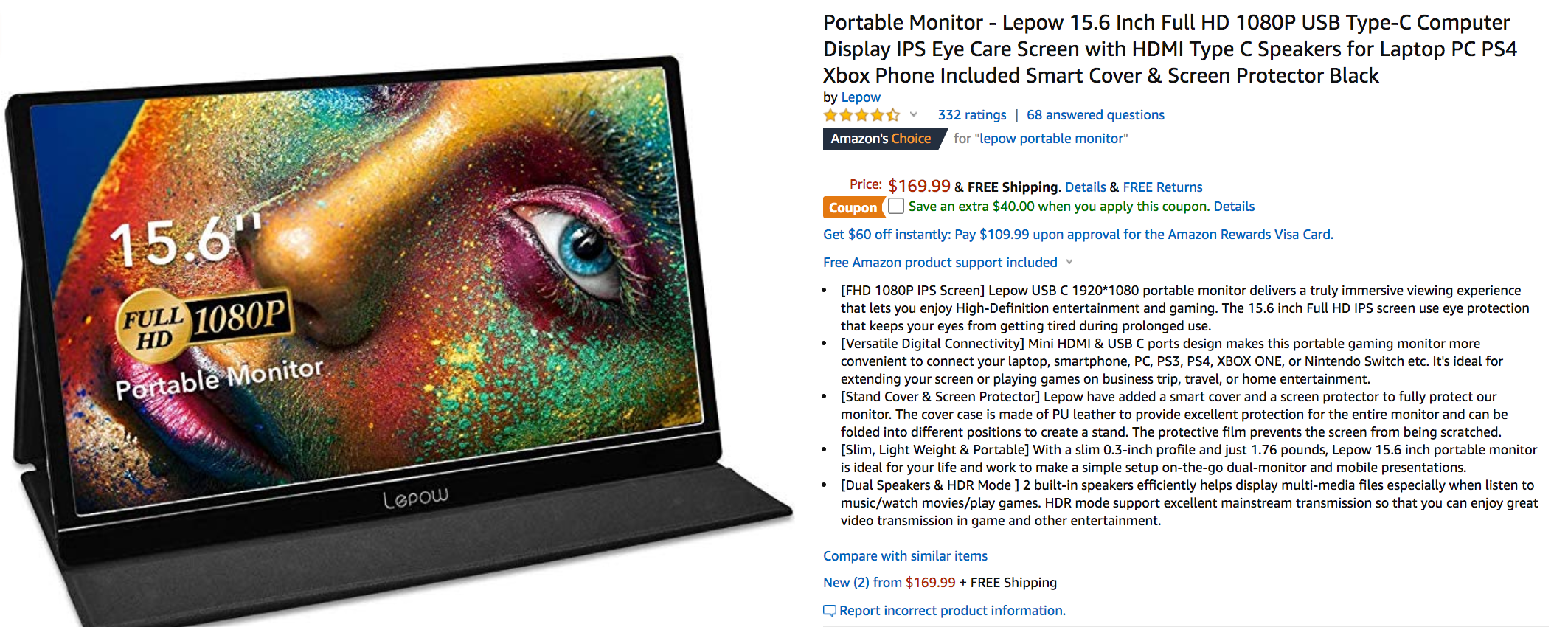 - Lepow 15.6" Portable Monitor: $129.99 (regularly $169, but there is a $40 off coupon) (This deal has expired.)