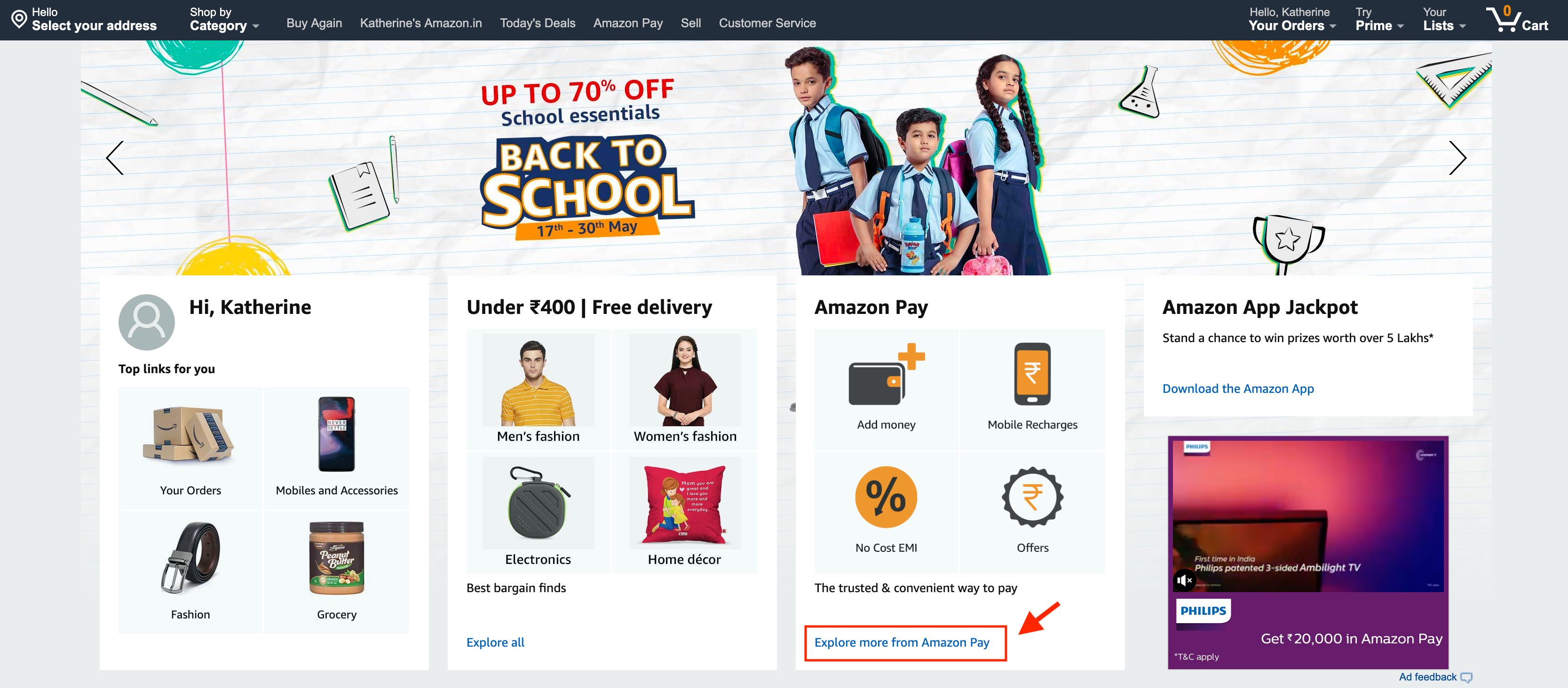 To access the flights, Amazon users must navigate to Amazon.in, the India-specific country page. Your usual US login works for this page, and the flights can be found under Amazon Pay by clicking on "Explore more from Amazon Pay" (marked with a red arrow in the screenshot below).