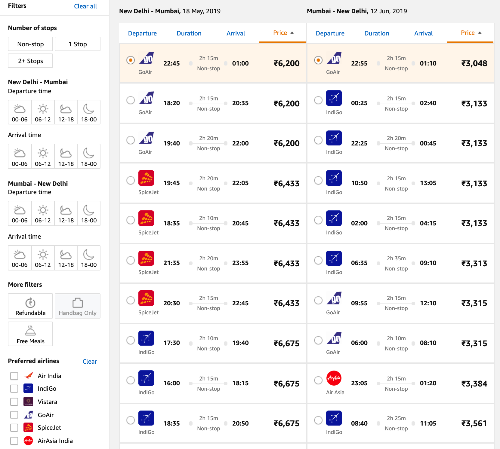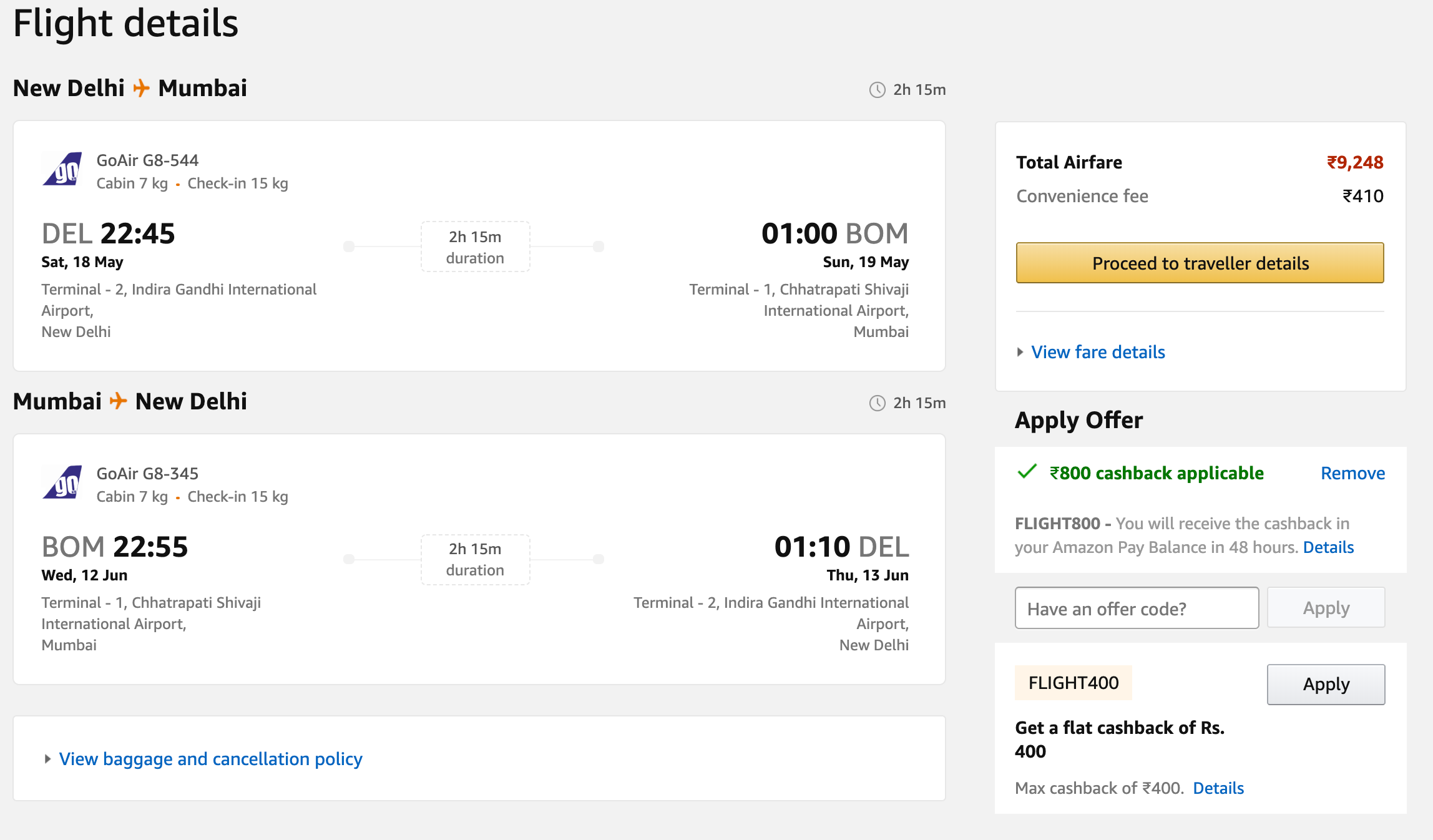 To celebrate the new travel launch, Amazon India is also offering a promotional rebate of up to 2,000 rupees, worth $28.44 USD as of the time of this post. The refund amount is relative to the booking total, and is available to both Prime and non-Prime members, who receive a lower discount. According to the check-out page, the refund will be added to your Amazon Pay balance within 48 hours of completed booking. Travelers will also see a nominal percentage-based convenience fee added at checkout; for a ~$130 round-trip ticket, the fee was around $5.