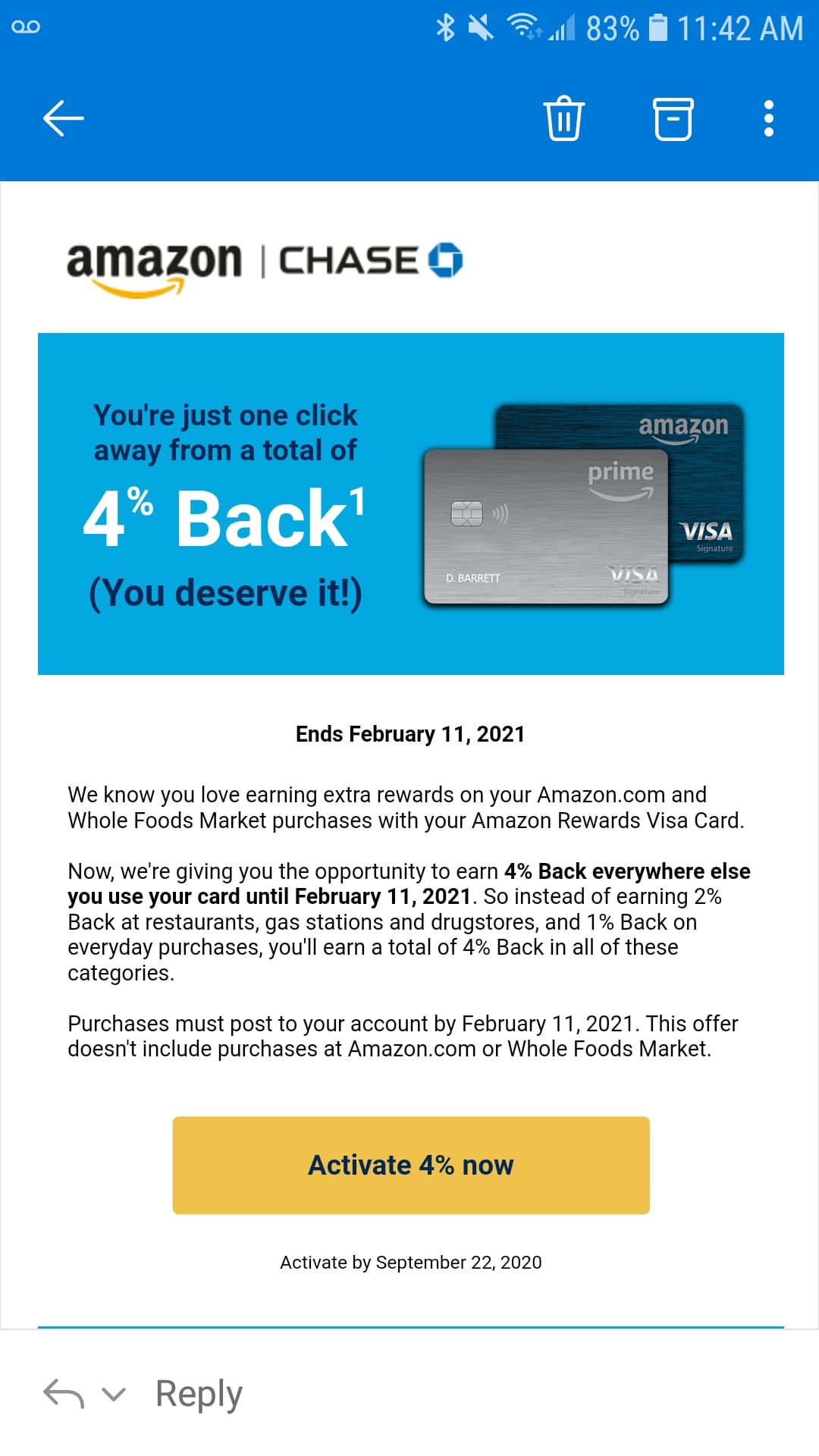 If you are a cardholder of the Amazon Prime Visa Signature Credit Card, make sure to check your email. A round of targeted offers have been sent out to some cardholders temporarily offering up to 4% back on all purchases (except Amazon and Whole Foods, which will continue to earn 5% back).