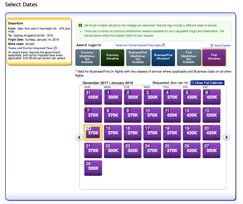 Turns out that AAdvantage is charging the highest fare possible because the one segment from JFK-LAX is in first on an in-demand date. There are certain days when this fare does have the flight from JFK-LAX in first and LAX-SYD in business — and there's a simple way to tell if you'll get seated in business or economy.