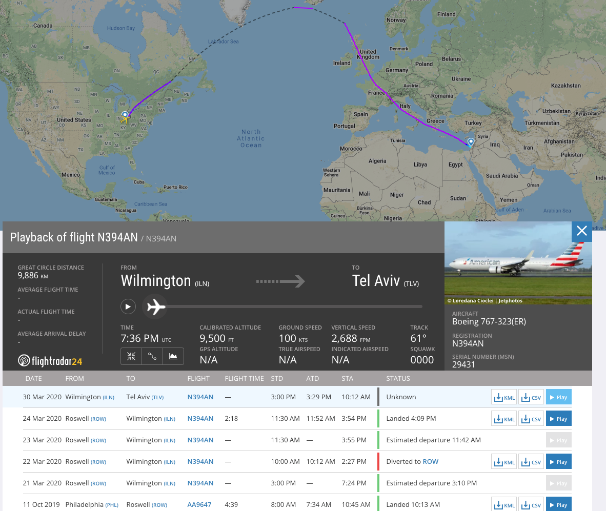 The first is on its way to Israel today to be converted from passenger to freighter. Flight-tracking site Flightradar24 showed on Tuesday that the 767 bearing the registration N394AN was in flight to Tel Aviv from a storage facility in Roswell, New Mexico, via a stop in Wilmington, Ohio.