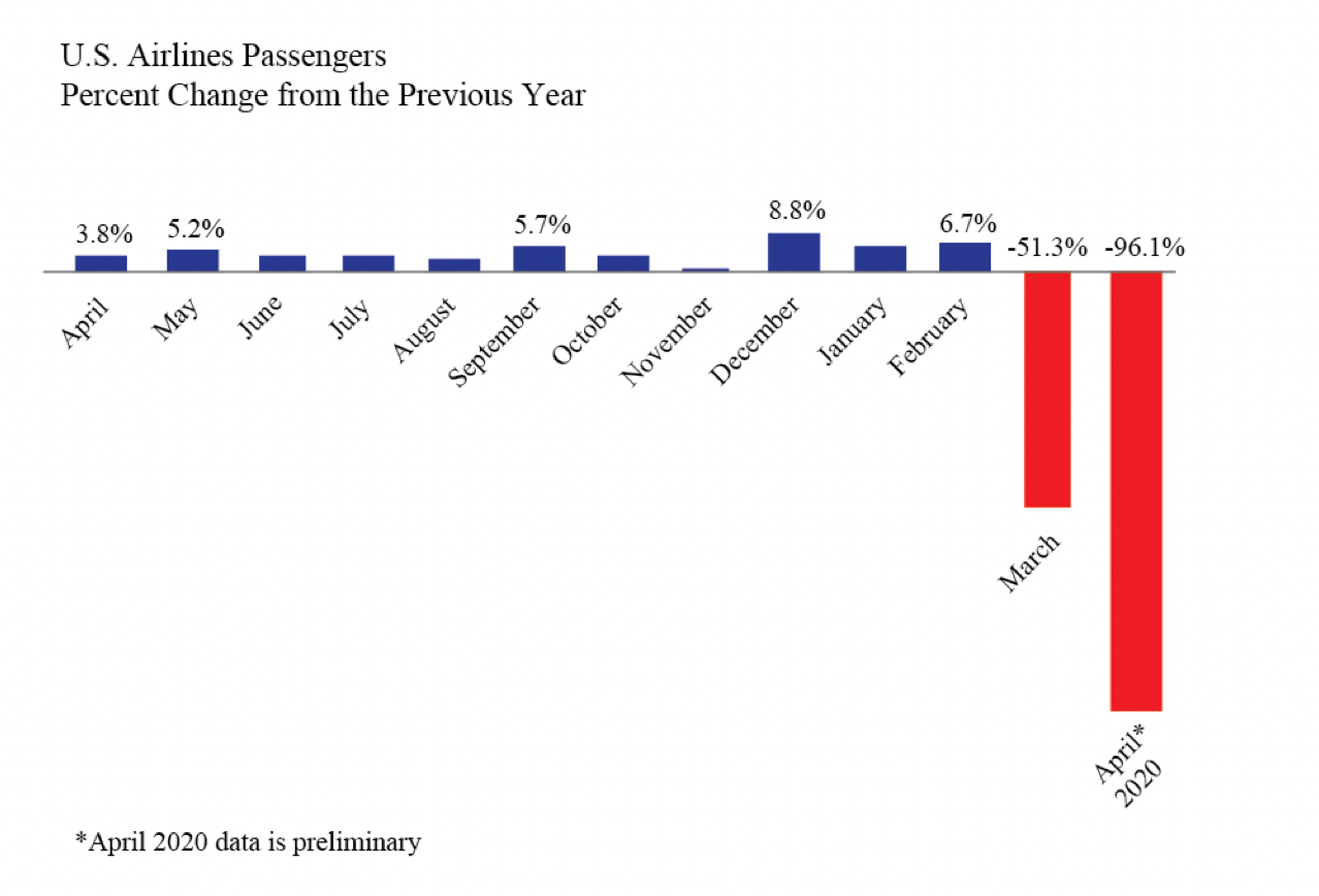 Airlines — including American — that received federal assistance under the CARES Act are barred from enacting layoffs and furloughs through September as a condition of that aid. The requirement comes even as demand for travel dropped an unprecedented 96% in April, according to data from the federal Bureau of Transportation Statistics.