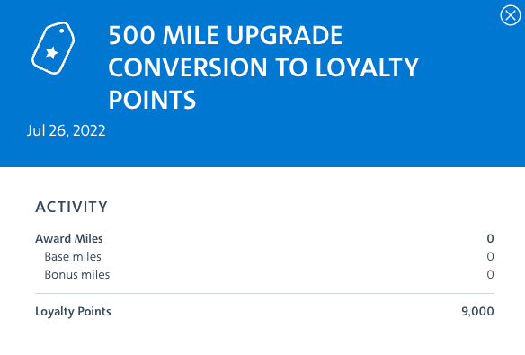 In my case, I had 36 unexpired 500-mile upgrades in my account as of July 26. At a rate of 250 Loyalty Points per e500, I received 9,000 Loyalty Points during the conversion process.
