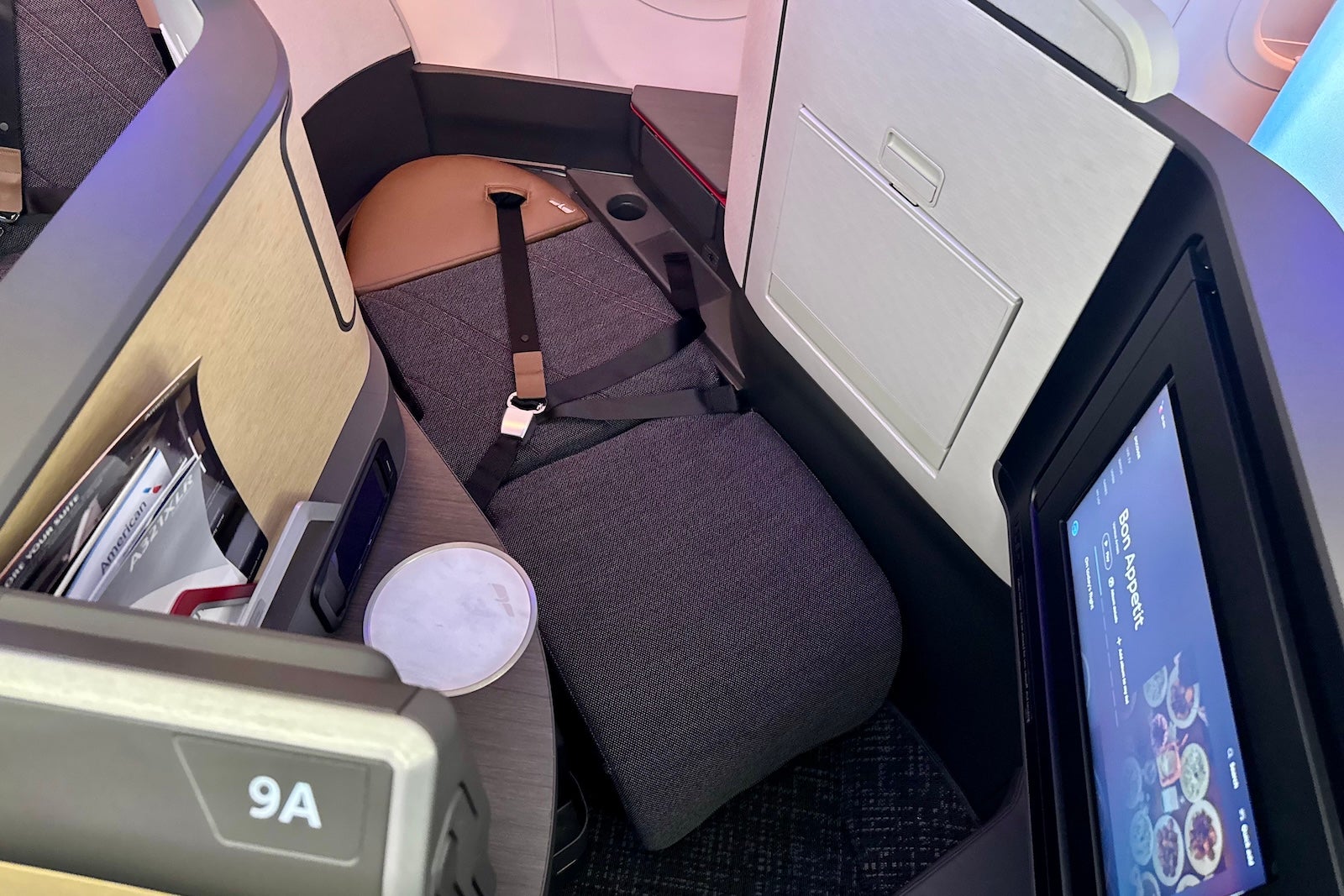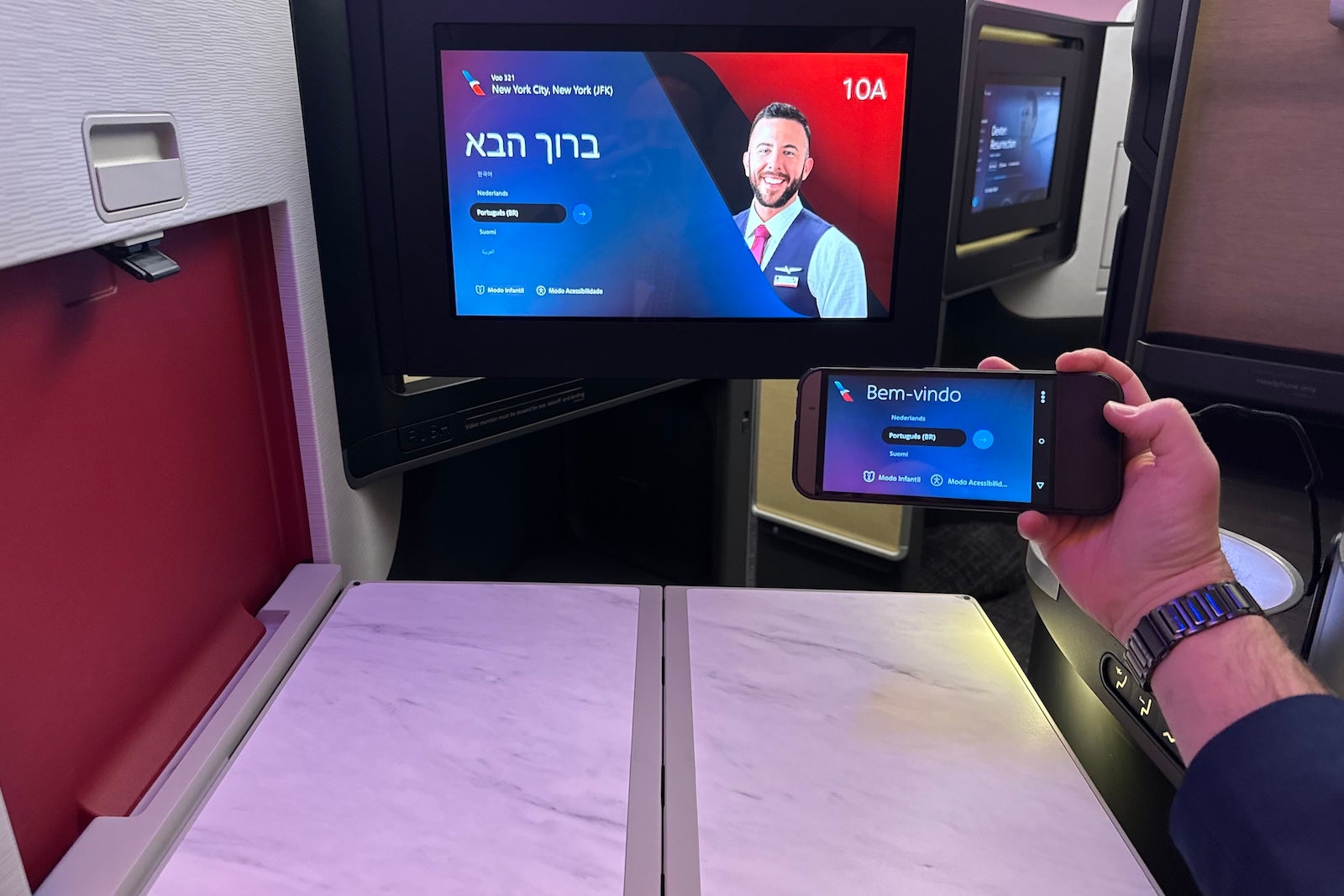 In a departure from American’s domestic fleet, there are seatback screens at every seat — and each is set up to allow passengers to connect their Bluetooth headphones.