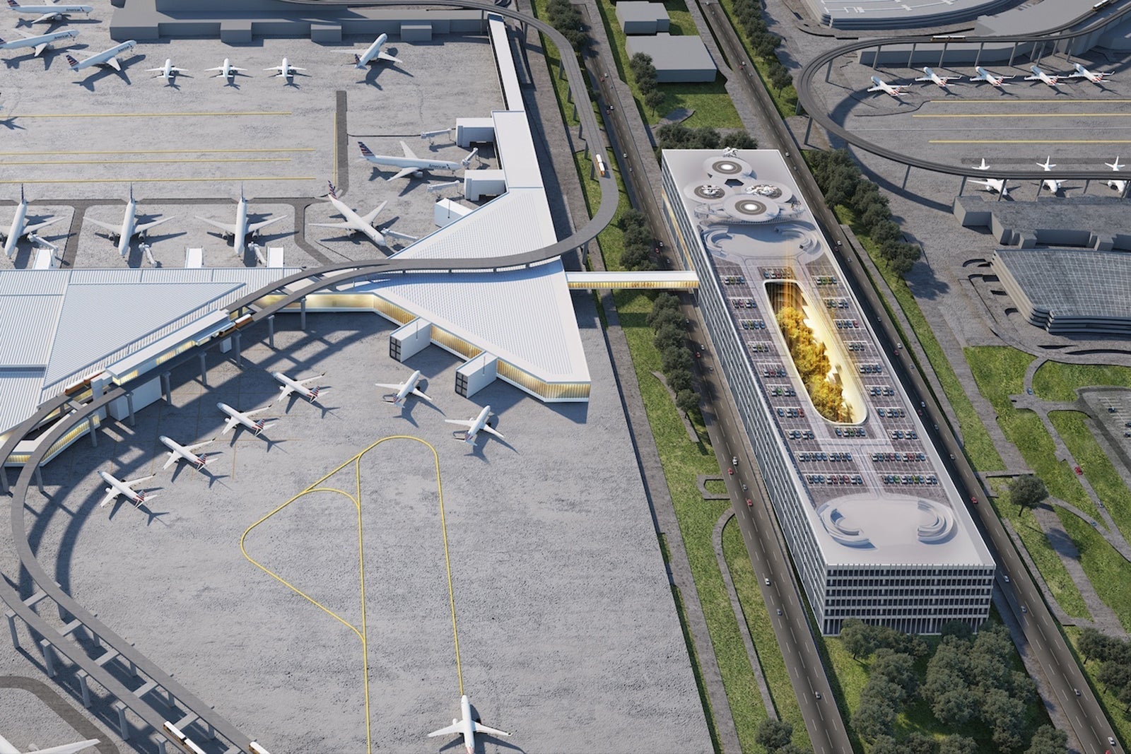 Construction plans call for a new parking garage and a reimagined airport check-in and lobby experience, plus a new Skylink station that would more seamlessly connect customers, airside, to DFW's existing terminals.