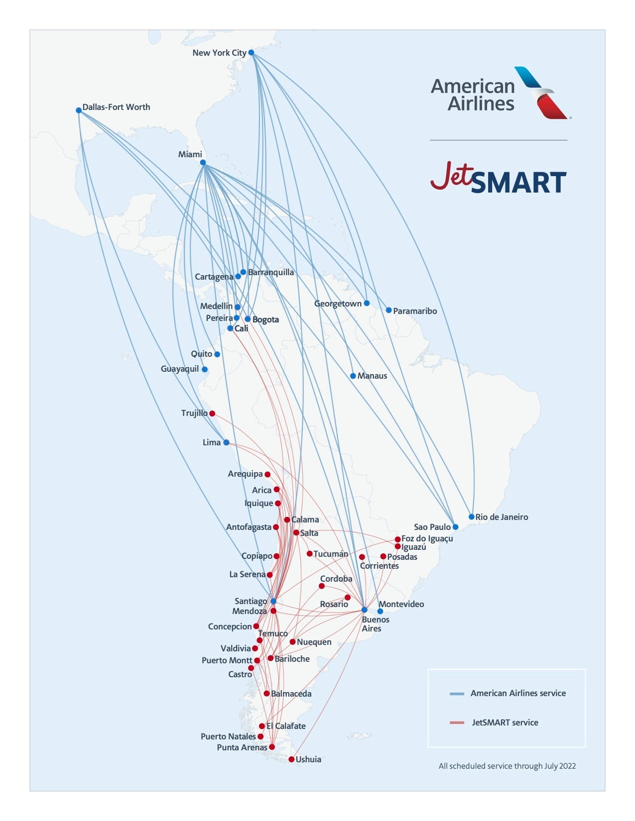 American operates flights to 17 cities in South America, while JetSmart currently services 33 cities. The airlines will offer connections in Cali, Medellin and Bogota, Colombia; Lima, Peru; Buenos Aires, Argentina; and Santiago, Chile.