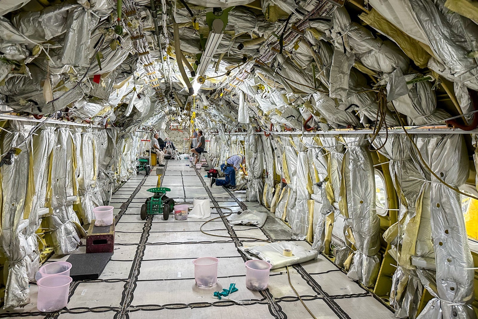The seats, the walls and the flooring were completely gutted from the aircraft. All that was left inside were gray insulation bags on all sides, which made the 737 look more like a cave than a plane.